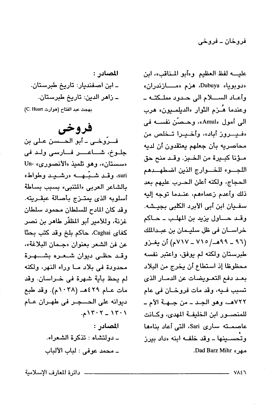 عليه لفظ العظيم و"أبو المناقب"، ابن "دوبويا" Dubuya, هزم "مازندران" وأعاد السلام إلى حدود مملكته -وعندما هُزم الثوار "الديلميون" هرب إلى أمول " Amul"، وحصّن نفسه فى "فيروز أباد"، وأخيرا تخلص من محاصريه بأن جعلهم يعتقدون أن لديه مؤنا كبيرة من الخبز. وقد منح حق اللجوء للخوارج الذين اضطهدهم الحجاج، ولكنه أعلن الحرب عليهم بعد ذلك وأعدم زعماءهم، عندما توجه إليه سفيان ابن أبى الأبرد الكلبى بجيشه. وقد حاول يزيد بن المهلب -حاكم خراسان فى ظل سليمان بن عبد الملك (96 - 99 هـ/ 715 - 717 م) أن يغزو طبرستان ولكنه لم يوفق، واعتبر نفسه محظوظا إذ استطاع أن يخرج من البلاد بعد دفع التعويضات عن الدمار الذى تسبب فيه، وقد مات فروخان فى عام 722 هـ، وهو الجد -من جهة الأم- للمنصور ابن الخليفة المهدى، وكانت عاصمته سارى Sari، التى أعاد بناءها وتحسينها- وقد خلفه ابنه "داد بيرز مهر" Dad Barz Mihr.