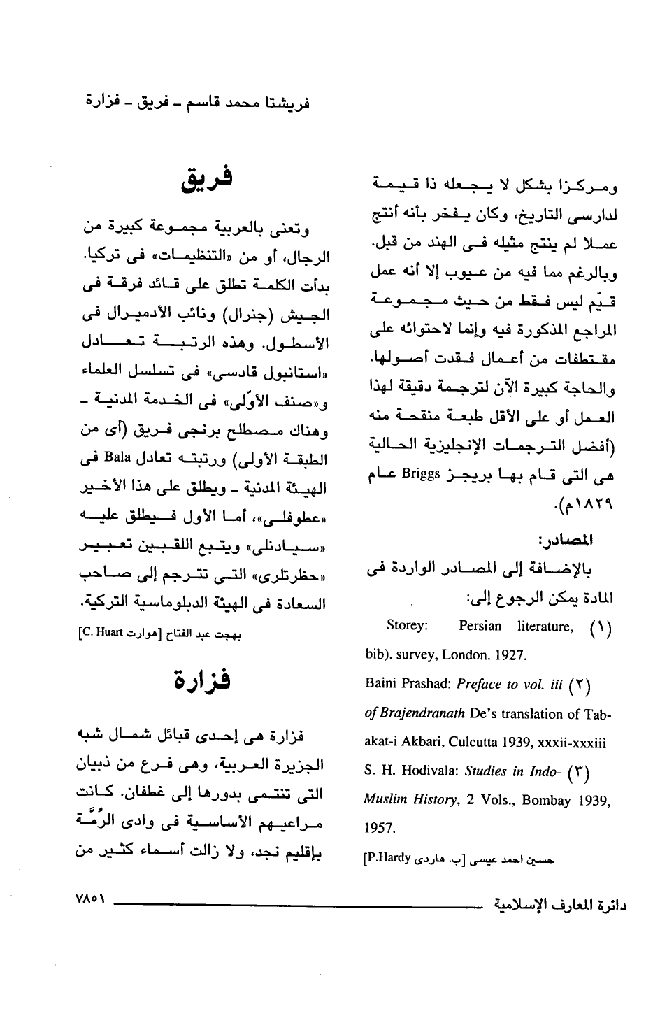 ومركزا بشكل لا يجعله ذا قيمة لدارسى التاريخ، وكان يفخر بأنه أنتج عملا لم ينتج مثيله فى الهند من قبل. وبالرغم هما فيه من عيوب إلا أنه عمل قيّم ليس فقط من حيث مجموعة المراجع المذكورة فيه وإنما لاحتوائه على مقتطفات من أعمال فقدت أصولها. والحاجة كبيرة الآن لترجمة دقيقة لهذا العمل أو على الأقل طبعة منقحة منه (أفضل الترجمات الإنجليزية الحالية هى التى قام بها بريجز Briggs عام 1829 م).