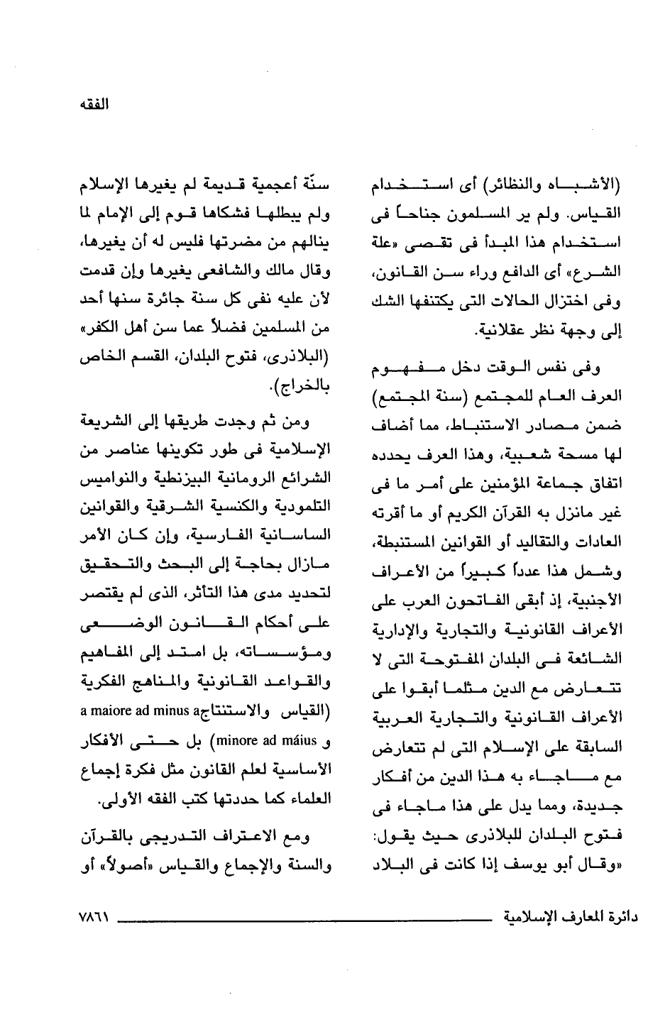 وفى نفس الوقت دخل مفهوم العرف العام للمجتمع (سنة المجتمع) ضمن مصادر الاستنباط، مما أضاف لها مسحة شعبية، وهذا العرف يحدده اتفاق جماعة المؤمنين على أمر ما فى غير ما نزل به القرآن الكريم أو ما أقرته العادات والتقاليد أو القوانين المستنبطة، وشمل هذا عددًا كبيرًا من الأعراف الأجنبية، إذ أبقى الفاتحون العرب على الأعراف القانونية والتجارية والإدارية الشائعة فى البلدان المفتوحة التى لا تتعارض مع الدين مثلما أبقوا على الأعراف القانونية والتجارية العربية السابقة على الإسلام التى لم تتعارض مع ما جاء به هذا الدين من أفكار جديدة، ومما يدل على هذا ما جاء فى فتوح البلدان للبلاذرى حيث يقول: "وقال أبو يوسف إذا كانت فى البلاد سنّة أعجمية قديمة لم يغيرها الإسلام ولم يبطلها فشكاها قوم إلى الإمام لما ينالهم من مضرتها فليس له أن يغيرها، وقال مالك والشافعى يغيرها وإن قدمت لأن عليه نفى كل سنة جائرة سنها أحد من المسلمين فضلًا عما سن أهل الكفر" (البلاذرى، فتوح البلدان، القسم الخاص بالخراج).
