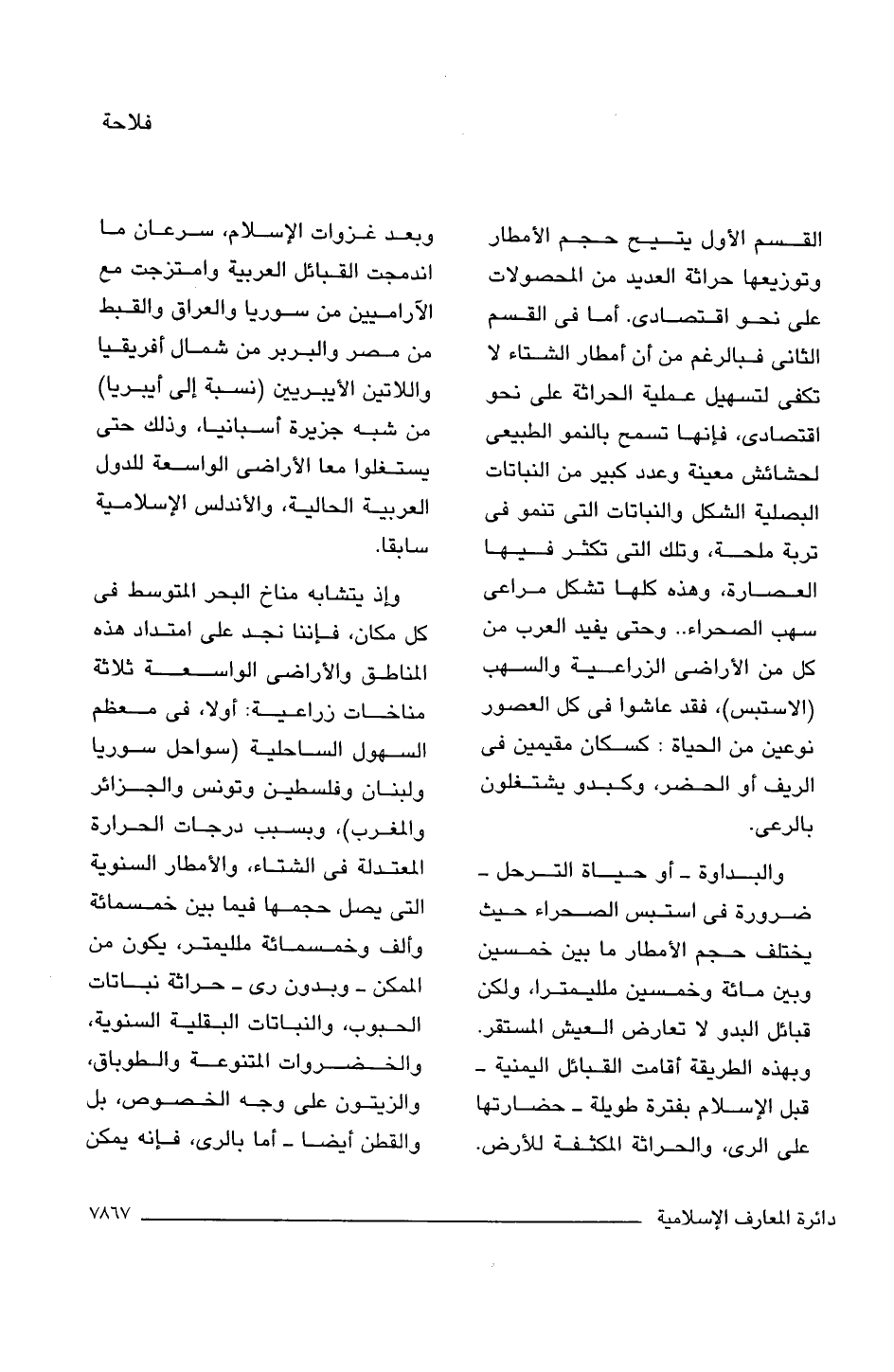القسم الأول يتيح حجم الأمطار وتوزيعها حراثة العديد من المحصولات على نحو اقتصادى. أما فى القسم الثانى فبالرغم من أن أمطار الشتاء لا تكفى لتسهيل عملية الحراثة على نحو اقتصادى، فإنها تسمح بالنمو الطبيعى لحشائش معينة وعدد كبير من النباتات البصلية الشكل والنباتات التى تنمو فى تربة ملحة، وتلك التى تكثر فيها العصارة، وهذه كلها تشكل مراعى سهب الصحراء. . وحتى يفيد العرب من كل من الأراضى الزراعية والسهب (الاستبس)، فقد عاشوا فى كل العصور نوعين من الحياة: كسكان مقيمين فى الريف أو الحضر، وكبدو يشتغلون بالرعى.