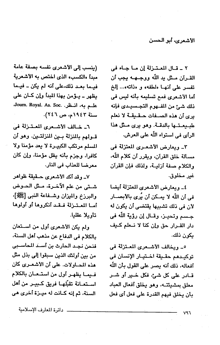 5 - ويخالف الأشعرى المعتزلة فى توكيدهم حقيقة اختيار الإنسان فى أفعاله، دلك أنه يصر على القول بأن الله قادر على كل شئ، فكل خير أو شر معلق بمشيثته، وهو يخلق افعال العباد بأن يخلق فيهم القدرة على فعل أى فعل (ينسب إلى الأشعرى نفسه بصفة عامة مبدأ "الكسب" الذى اختص به الأشعرية فيما بعد ذلك، على أنه لم يكن -فيما يظهر- يؤمن بهذا المبدأ وإن كان على علم به، انظر. . Joum. Royal. As. Soc سنة 1943 م، ص 246)