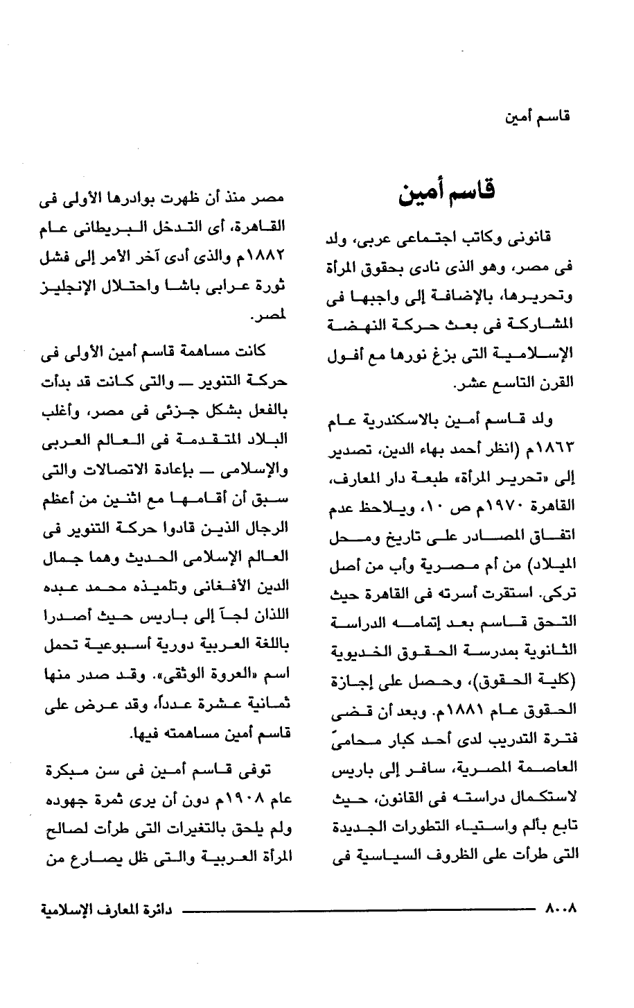 قانونى وكاتب اجتماعى عربى، ولد فى مصر، وهو الذى نادى بحقوق المرأة وتحريرها، بالإضافة إلى واجبها فى المشاركة فى بعث حركة النهضة الإسلامية التى بزغ نورها مع أفول القرن التاسع عشر.