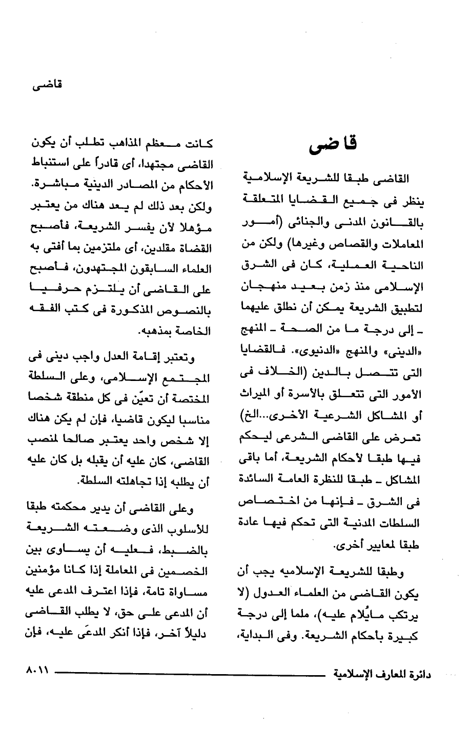 القاضى طبقا للشريعة الإسلامية ينظر فى جميع القضايا المتعلقة بالقانون المدنى والجنائى (أمور المعاملات والقصاص وغيرها) ولكن من الناحية العملية، كان فى الشرق الإسلامى منذ زمن بعيد منهجان لتطبيق الشريعة يمكن أن نطلق عليهما -إلى درجة ما من الصحة- المنهج "الدينى" والمنهج "الدنيوى". فالقضايا التى تتصل بالدين (الخلاف فى الأمور التى تتعلق بالأسرة أو الميراث أو المشاكل الشرعية الأخرى. . . الخ) تعرض على القاضى الشرعى ليحكم فيها طبقا لأحكام الشريعة، أما باقى المشاكل -طبقا للنظرة العامة السائدة فى الشرق- فإنها من اختصاص السلطات المدنية التى تحكم فيها عادة طبقا لمعايير أخرى.