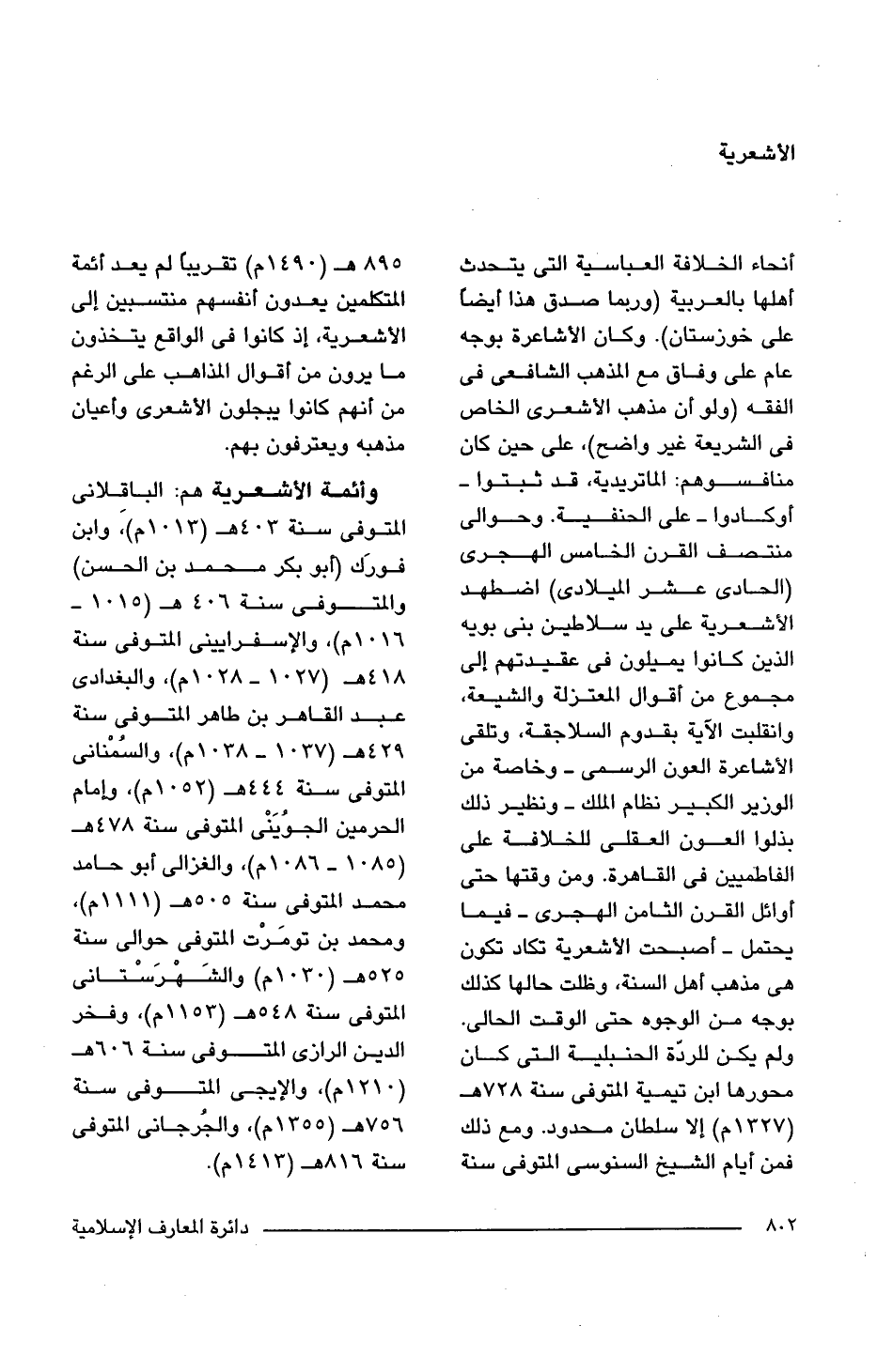 أنحاء الخلافة العباسية التى يتحدث أهلها بالعربية (وربما صدق هذا أيضًا على خوزستان). وكان الأشاعرة بوجه عام على وفاق مع المذهب الشافعى فى الفقه (ولو أن مذهب الأشعرى الخاص فى الشريعة غير واضح)، على حين كان منافسوهم: الماتريدية، قد ثبتوا -أوكادوا- على الحنفية. وحوالى منتصف القرن الخامس الهجرى (الحادى عشر الميلادى) اضطهد الأشعرية على يد سلاطين بنى بويه الذين كانوا يميلون فى عقيدتهم إلى مجموع من أقوال المعتزلة والشيعة، وانقلبت الآية بقدوم السلاجقة، وتلقى الأشاعرة العون الرسمى -وخاصة من الوزير الكبير نظام الملك- ونظير ذلك بذلوا العون العقلى للخلافة على الفاطميين فى القاهرة. ومن وقتها حتى أوائل القرن الثامن الهجرى -فيما يحتمل- أصبحت الأشعرية تكاد تكون هى مذهب أهل السنة، وظلت حالها كذلك بوجه من الوجوه حتى الوقت الحالى. ولم يكن للردّة الحنبلية التى كان محورها ابن تيمية المتوفى سنة 728 هـ (1327 م) إلا سلطان محدود. ومع ذلك فمن أيام الشيخ السنوسى المتوفى سنة 895 هـ (1490 م) تقريبًا لم يعد أئمة المتكلمين يعدون أنفسهم منتسبين إلى الأشعرية، إذ كانوا فى الواقع يتخذون ما يرون من أقوال المذاهب على الرغم من أنهم كانوا يبجلون الأشعرى وأعيان مذهبه ويعترفون بهم.