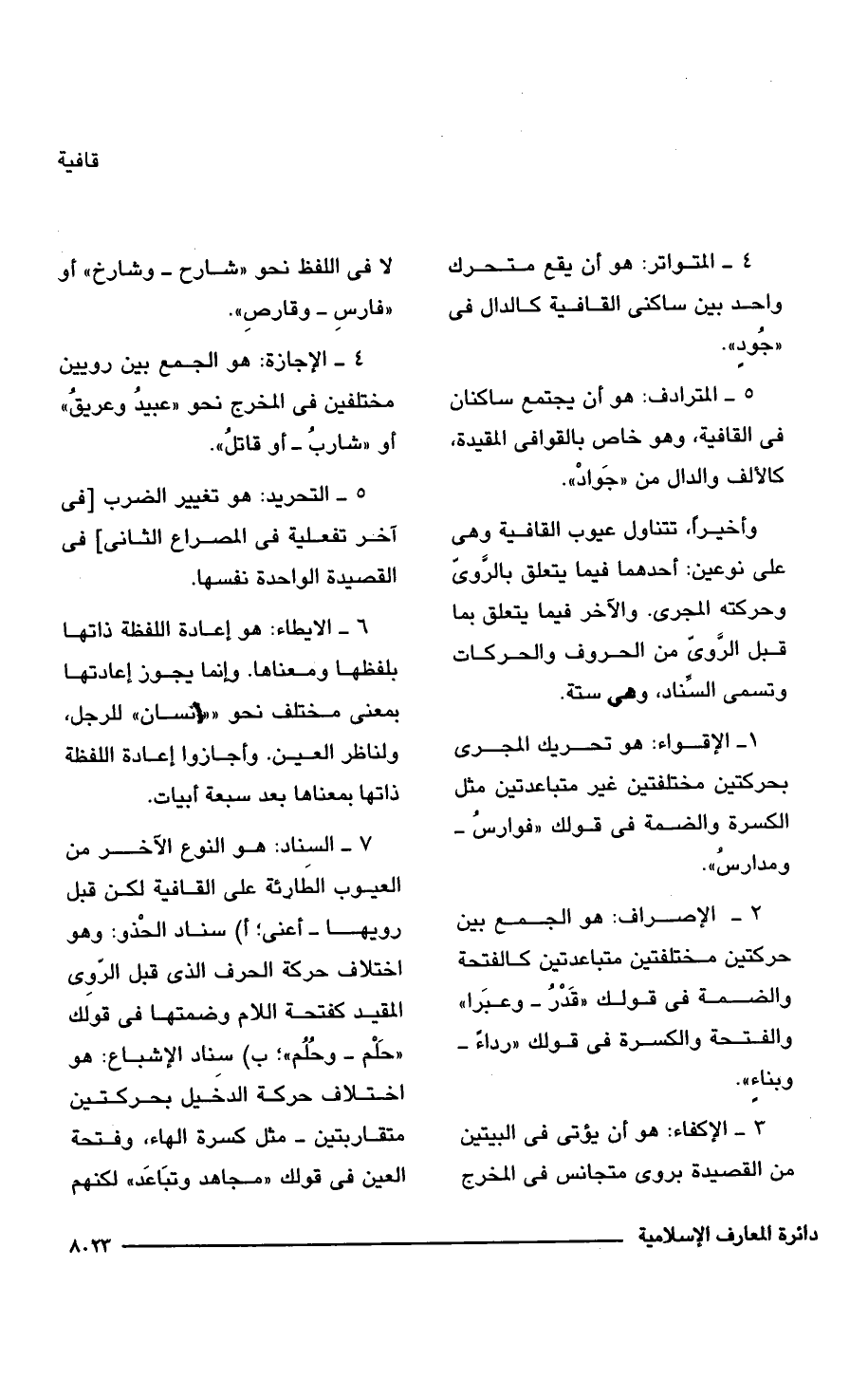 وأخيرًا، تتناول عيوب القافية وهى على نوعين: أحدهما فيما يتعلق بالرَّوى وحركته المجرى. والآخر فيما يتعلق بما قبل الرَّوى من الحروف والحركات وتسمى السِّناد، وهى ستة.