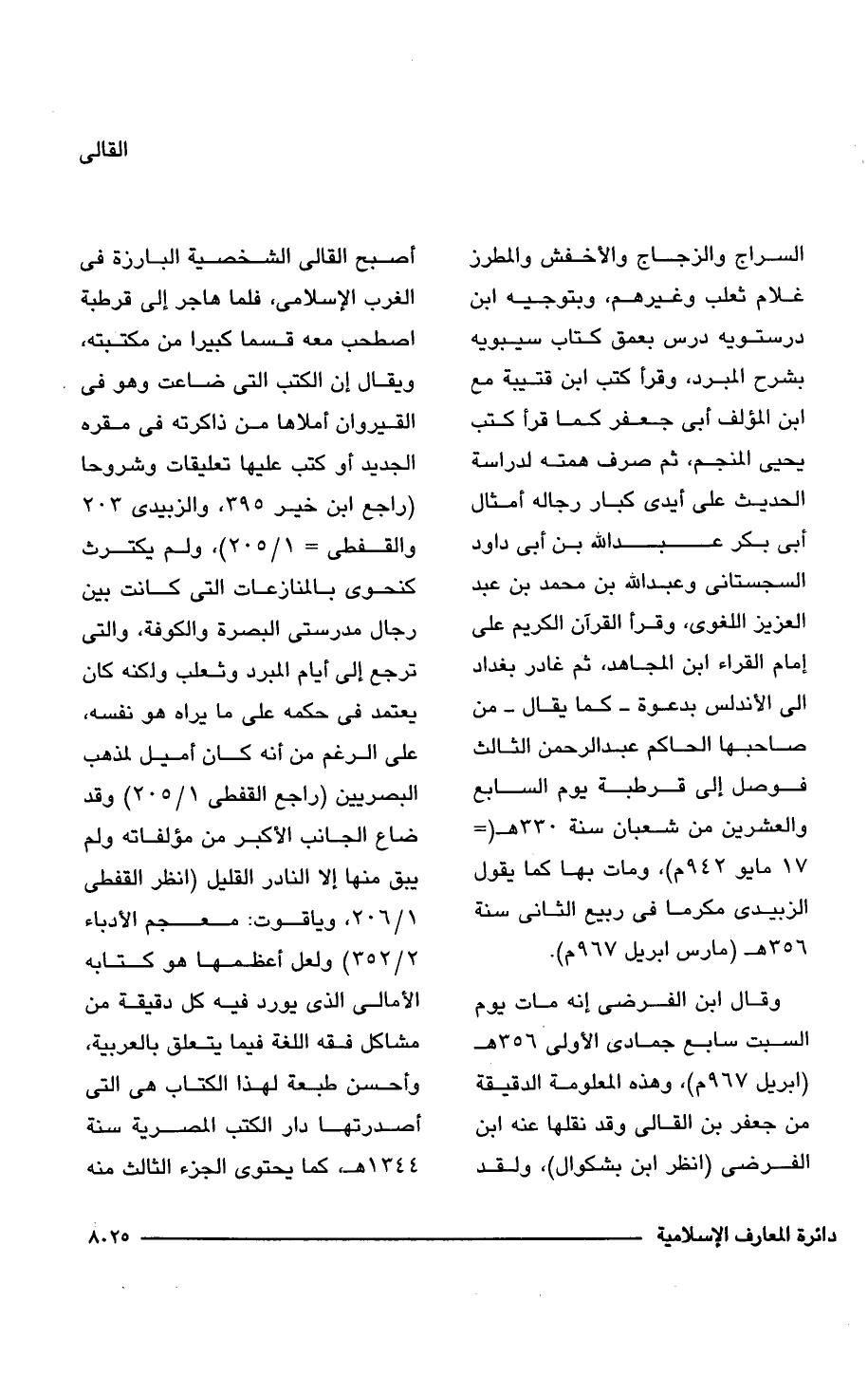 وقال ابن الفرضى إنه مات يوم السبت سابع جمادى الأولى 356 هـ (ابريل 967 م)، وهذه المعلومة الدقيقة من جعفر بن القالى وقد نقلها عنه ابن الفرضى (انظر ابن بشكوال)، ولقد أصبح القالى الشخصية البارزة فى الغرب الإسلامى، فلما هاجر إلى قرطبة اصطحب معه قسمًا كبيرًا من مكتبته، ويقال إن الكتب التى ضاعت وهو فى القيروان أملاها من ذاكرته فى مقره الجديد أو كتب عليها تعليقات وشروحًا (راجع ابن خير 395، والزبيدى 203 والقفطى = 1/ 205)، ولم يكترث كنحوى بالمنازعات التى كانت بين رجال مدرستى البصرة والكوفة، والتى ترجع إلى أيام المبرد وثعلب واكنه كان يعتمد فى حكمه على ما يراه هو نفسه، على الرغم من أنه كان أميل لمذهب البصريين (راجع القفطى 1/ 205) وقد ضاع الجانب الأكبر من مؤلفاته ولم يبق منها إلا النادر القليل (انظر القفطى 1/ 206، وياقوت: معجم الأدباء 2/ 352) ولعل أعظمها هو كتابه الأمالى الذى يورد فيه كل دقيقة من مشاكل فقه اللغة فيما يتعلق بالعربية، وأحسن طبعة لهذا الكتاب هى التى أصدرتها دار الكتب المصرية سنة 1344 كما يحتوى الجزء الثالث منه