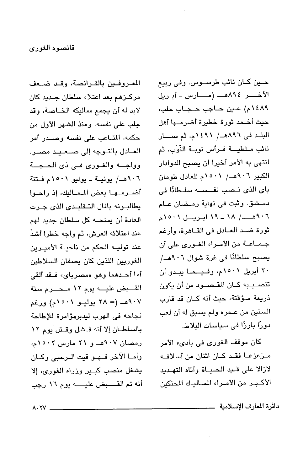 حين كان نائب طرسوس. وفى ربيع الآخر 894 (مارس - أبريل 1489 م) حاجب حجاب حلب، حيث أخمد ثورة خطيرة أضرمها أهل البلد فى 896 هـ/ 1491 م، ثم صار نائب ملطية فرأس نوبة النَّوَب، ثم انتهى به الأمر أخيرًا أن يصبح الدوادار الكبير 906 هـ/ 1501 م للعادل طومان باى الذى نصب نفسه سلطانًا فى دمشق. وثبت فى نهاية رمضان عام 906 هـ/ 18 - 19 أبريل 1501 م ثورة ضد العادل فى القاهرة، وأرغم جماعة من الأمراء الغورى على أن يصبح سلطانًا فى غرة شوال 906 هـ/ 20 أبريل 1501 م، وفيما يبدو أن تنصيبه كان المقصود من أن يكون ذريعة مؤقتة، حيث أنه كان قد قارب الستين من عمره ولم يسبق له أن لعب دورًا بارزًا فى سياسات البلاط.