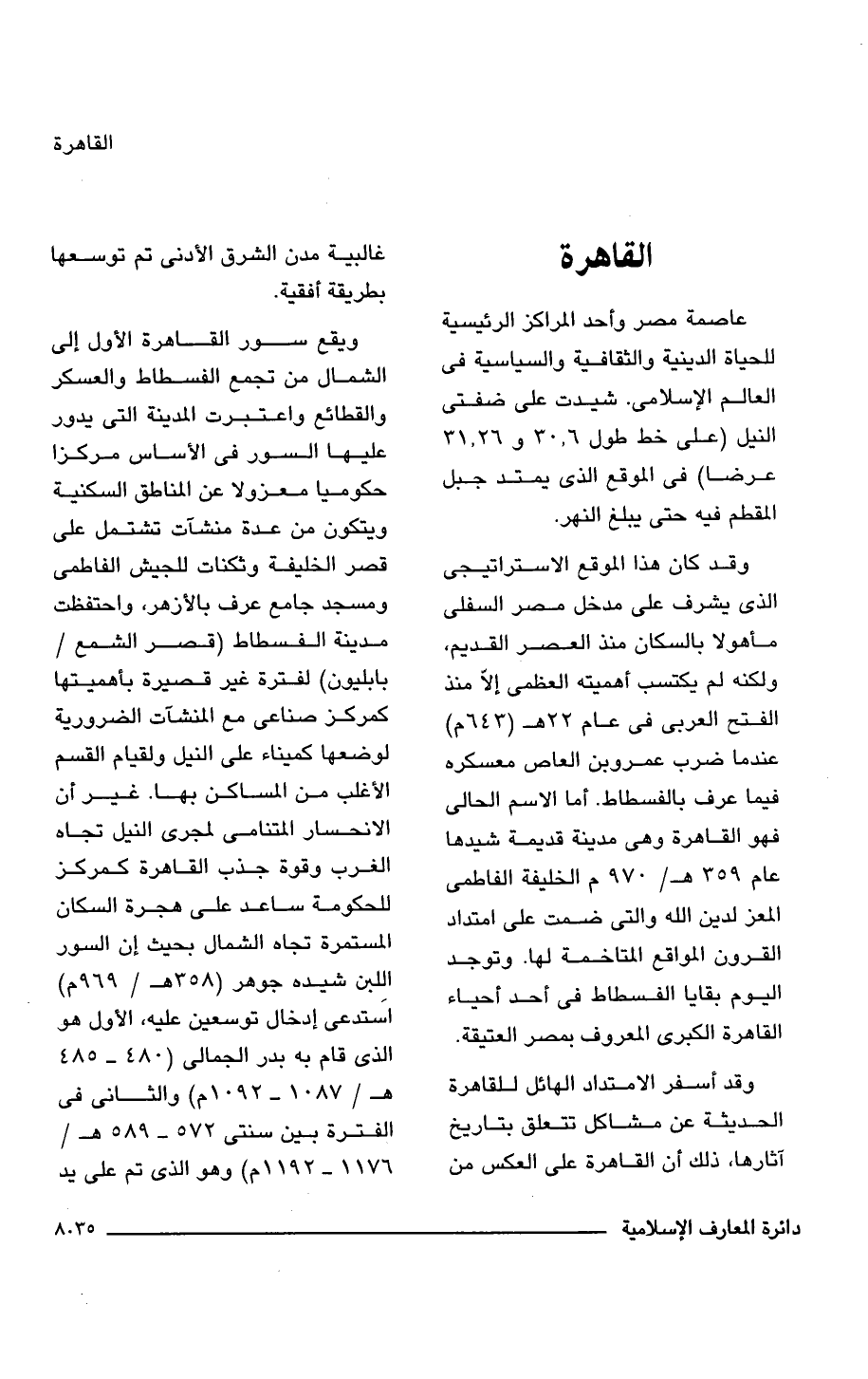 عاصمة مصر وأحد المراكز الرئيسية للحياة الدينية والثقافية والسياسية فى العالم الإسلامى. شيدت على ضفتى النيل (على خط طول 30.6 و 31.26 عرضًا) فى الموقع الذى يمتد جبل المقطم فيه حتى يبلغ النهر.