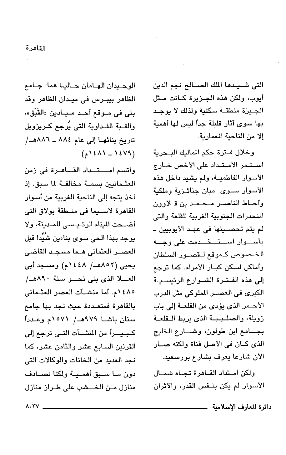 واتسم امتداد القاهرة فى زمن العثمانيين بسمة مخالفة لما سبق. إذ أخذ يتجه إلى الناحية الغربية من أسوار القاهرة لاسيما فى منطقة بولاق التى أضحت الميناء الرئيسى للمدينة، ولا يوجد بهذا الحى سوى بناءين شُيِّدا قبل العصر العثمانى هما مسجد القاضى يحيى (852 هـ/ 1448 م) ومسجد أبى العلا الذى بنى نحو سنة 890 هـ/ 1485 م. أما منشآت العصر العثمانى بالقاهرة فمتعددة حيث نجد بها جامع سنان باشا 979 هـ/ 1571 م وعددًا كبيرًا من المنشآت التى ترجع إلى القرنين السابع عشر والثامن عشر، كما نجد العديد من الخانات والوكالات التى دون ما سبق أهمية ولكنا نصادف منازل من الخشب على طراز منازل
