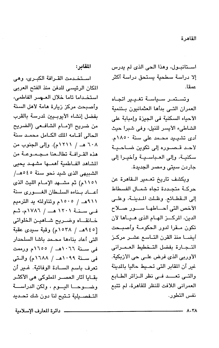 ويكشف تاريخ تعمير القاهرة عن حركة متجددة تجاه شمال الفسطاط إلى القطائع. وظلت المدينة، وعلى الأخص التى أحاطها سور صلاح الدين، المركز الهام الذى هيأها لأن تكون مقرًا لدور الحكومة وأصبحت أيضًا منذ القرن التاسع عشر مركز التجارة بفضل التخطيط العمرانى الأوربى الذى فرض على حى الأزبكية. غير أن المقابر التى تحيط حاليا بالمدينة والتى تعد فى نظر الزائر الطابع العمرانى اللافت للنظر للقاهرة، لم تتبع نفس التطور.