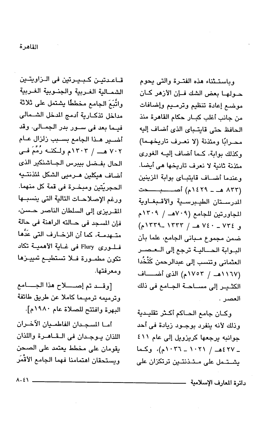 وكان جامع الحاكم أكثر تقليدية وذلك لأنه ينفرد بوجود زيادة فى أحد جوانبه يرجعها كريزويل إلى عام 411 - 427 هـ/ 1021 - 1036 م)، وكما يشتمل على مئذنتين ترتكزان على قاعدتين كبيرتين فى الزاويتين الشمالية الغربية والجنوبية الغربية واتَّبَعَ الجامع مخططا يشتمل على ثلاثة مداخل تذكارية أدمج المدخل الشمالى فيما بعد فى سور بدر الجمالى. وقد أضير هذا الجامع بسبب زلزال عام 702 هـ/ 1303 م , لكنه رُمِّمَ فى الحال بفضل بيبرس الجاشنكير الذى أضاف هيكلين هرميى الشكل لمئذنتيه الحجريّتين ومبخرة فى قمة كل منهما. ورغم الاصلاحات التالية التى ينسبها المقريزى إلى السلطان الناصر حسن، فإن المسجد فى حالته الراهنة فى حالة متهدمة، كما أن الزخارف التى عَدَّها فلورى Flury فى غاية الأهمية تكاد تكون مطمورة فلا تستطيع تمييزها ومعرفتها.