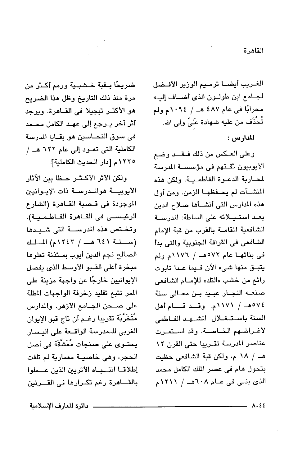 وعلى العكس من ذلك فقد وضع الأيوبيون ثقتهم فى مؤسسة المدرسة لمحاربة الدعوة الفاطمية، ولكن هذه المنشآت لم يحفظها الزمن. ومن أول هذه المدارس التى أنشأها صلاح الدين بعد استيلائه على السلطة: المدرسة الشافعية المقامة بالقرب من قبة الإمام الشافعى فى القرافة الجنوبية والتى بدأ فى بنائها عام 572 هـ/ 1176 م ولم يتبق منها شئ الآن فيما عدا تابوت رائع من خشب "التك" للإمام الشافعى صنعه النجار عبيد بن معالى سنة 574 هـ/ 1171 م. وقد قام أهل السنة باستغلال المشهد الفاطمى لأغراضهم الخاصة. وقد استمرت عناصر المدرسة تقريبًا حتى القرن 12 هـ/ 18 م، ولكن قبة الشافعى حظيت بتحول هام فى عصر الملك الكامل محمد الذى بنى فى 608 هـ/ 1211 م ضريحًا بقبة خشبية ورمم أكثر من مرة منذ ذلك التاريخ وظل هذا الضريح هو الأكثر تبجيلا فى القاهرة. ويوجد أثر آخر يرجع إلى عهد الكامل محمد فى سوق النحاسين هو بقايا المدرسة الكاملية التى تعود إلى عام 622 هـ/ 1225 م [دار الحديث الكاملية].