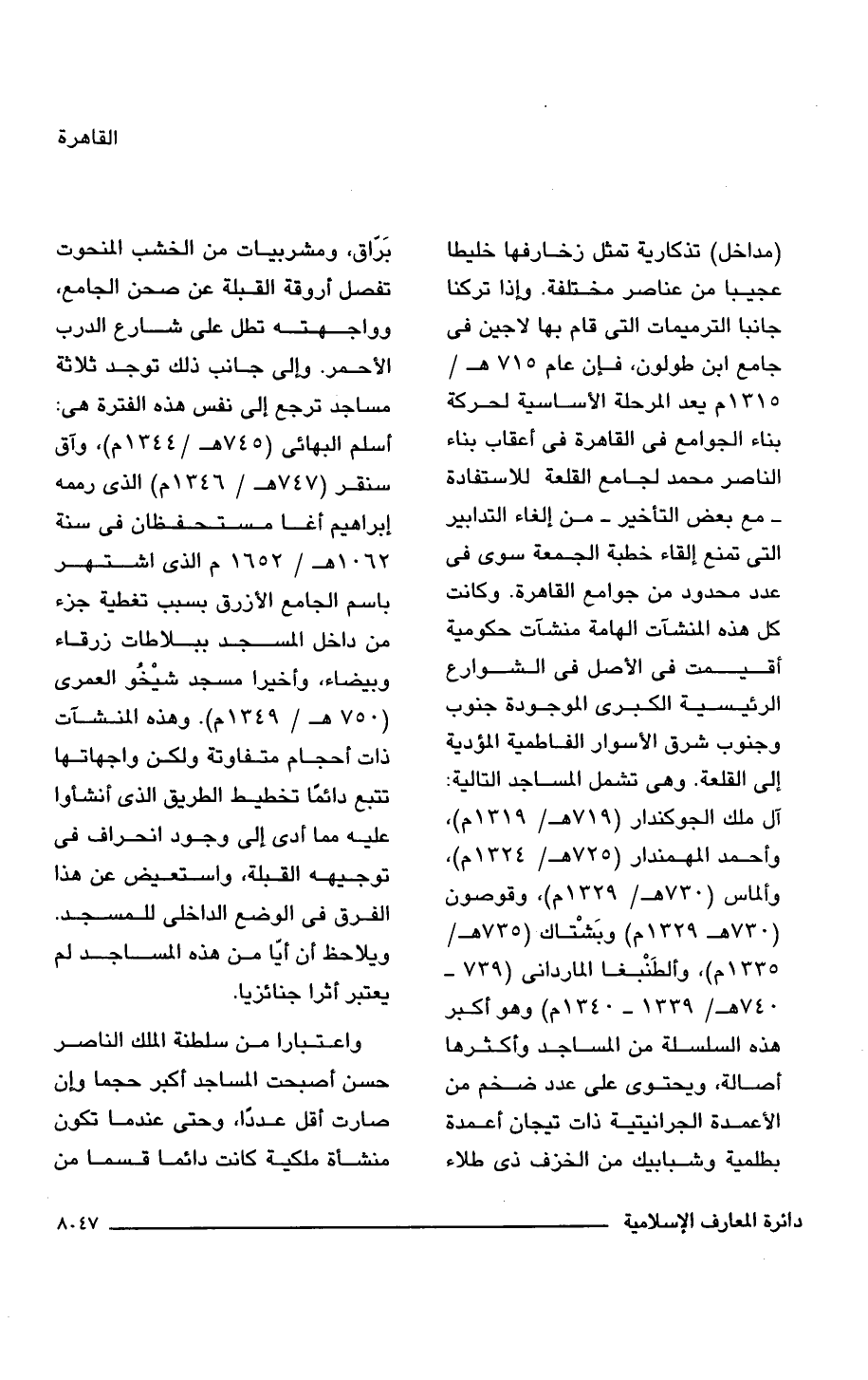 (مداخل) تذكارية تمثل زخارفها خليطا عجيبا من عناصر مختلفة. وإذا تركنا جانبا الترميمات التى قام بها لاجين فى جامع ابن طولون، فإن عام 715 هـ/ 1315 م يعد المرحلة الأساسية لحركة بناء الجوامع فى القاهرة فى أعقاب بناء الناصر محمد لجامع القلعة للاستفادة -مع بعض التأخير- من إلغاء التدابير التى تمنع إلقاء خطبة الجمعة سوى فى عدد محدود من جوامع القاهرة. وكانت كل هذه المنشآت الهامة منشآت حكومية أقيمت فى الأصل فى الشوارع الرئيسية الكبرى الموجودة جنوب وجنوب شرق الأسوار الفاطمية المؤدية إلى القلعة. وهى تشمل المساجد التالية: آل ملك الجوكندار (719 هـ/ 1319 م)، وأحمد المهمندار (725 هـ/ 1324 م)، وألماس (730 هـ/ 1329 م)، وقوصون (730 هـ/ 1329 م) وبَشْتاك (735 هـ/ 1335 م)، وألطَنْبغا الماردانى (739 - 740 هـ/ 1339 - 1340 م) هو أكبر هذه السلسلة من المساجد وأكثرها أصالة، ويحتوى على عدد ضخم من الأعمدة الجرانيتية ذات تيجان أعمدة بطلمية وشبابيك من الخزف ذى طلاء بَرّاق، ومشربيات من الخشب المنحوت تفصل أروقة القبلة عن صحن الجامع، وواجهته تطل على شارع الدرب الأحمر. وإلى جانب ذلك توجد ثلاثة مساجد ترجع إلى نفس هذه الفترة هى: أسلم البهائى (745 هـ/ 1344 م)، وآق سنقر (747 هـ/ 1346 م) الذى رممه إبراهيم أغا مستحفظان فى سنة 1062 هـ/ 1652 م الذى اشتهر باسم الجامع الأزرق بسبب تغطية جزء من داخل المسجد ببلاطات زرقاء وبيضاء، وأخيرًا مسجد شيْخُو العمرى (750 هـ/ 1349 م). وهذه المنشآت ذات أحجام متفاوتة ولكن واجهاتها تتبع دائمًا تخطيط الطريق الذى أنشأوا عليه مما أدى إلى وجود انحراف فى توجيهه القبلة، واستعيض عن هذا الفرق فى الوضع الداخلى للمسجد. ويلاحظ أن أيًّا من هذه المساجد لم يعتبر أثرا جنائزيا.