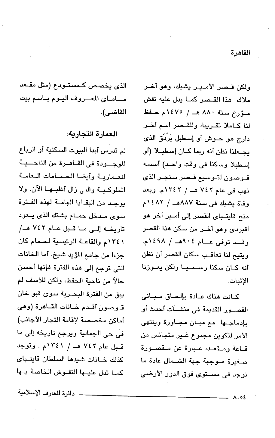 لم تدرس أبدا البيوت السكنية أو الرباع الموجودة فى القاهرة من الناحية المعمارية وأيضا الحمامات العامة المملوكية والتى زال أغلبها الآن. ولا يوجد من البقايا الهامة لهذه الفترة سوى مدخل حمام بشتك الذى يعود تاريخه إلى ما قبل عام 742 هـ/ 1341 م والقاعة الرئيسية لحمام كان جزءا من جامع المؤيد شيخ. أما الخانات التى ترجع إلى هذه الفترة فإنها أحسن حالًا من ناحية الحفظ، ولكن للأسف لم يبق من الفترة البحرية سوى قبو خان قوصون أقدم خانات القاهرة (وهى أماكن مخصصة لإقامة التجار الأجانب) فى حى الجمالية ويرجع تاريخه إلى ما قبل عام 742 هـ/ 1341 م. وتوجد كذلك خانات شيدها السلطان قايتباى كما تدل عليها النقوش الخاصة بها