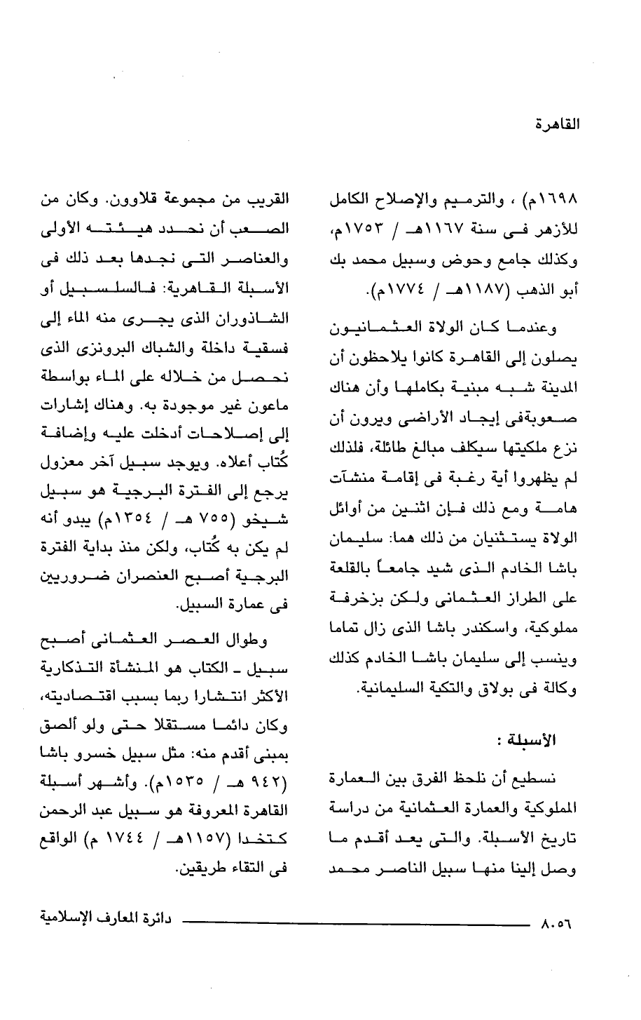 وطوال العصر العثمانى أصبح سبيل - الكتاب هو المنشأة التذكارية الأكثر انتشارًا ربما بسبب اقتصاديته، وكان دائما مستقلا حتى ولو ألصق بمبنى أقدم منه: مثل سبيل خسرو باشا (942 هـ/ 1535 م). وأشهر أسبلة القاهرة المعروفة هو سبيل عبد الرحمن كتخدا (1157 هـ/ 1535 م) الواقع فى التقاء طريقين.