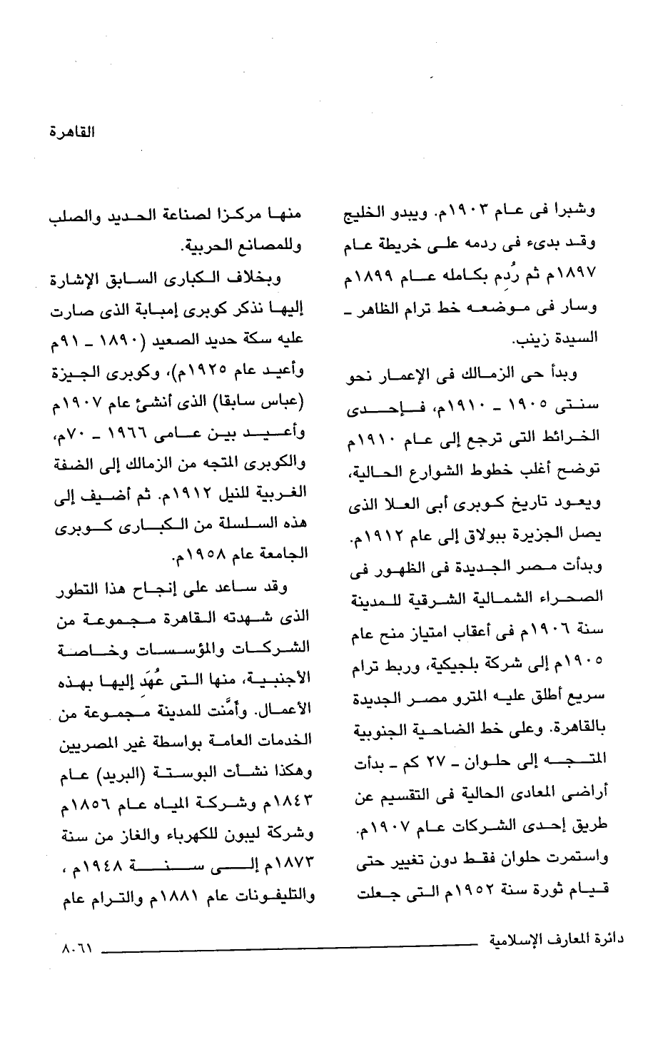 وبدأ حى الزمالك فى الإعمار نحو سنتى 1905 - 1910 م، فإحدى الخرائط التى ترجع إلى عام 1910 م. توضح أغلب خطوط الشوارع الحالية، ويعود تاريخ كوبرى أبى العلا الذى يصل الجزيرة ببولاق إلى عام 1912 م. وبدأت مصر الجديدة فى الظهور فى الصحراء الشمالية الشرقية للمدينة سنة 1906 م فى أعقاب امتياز منح عام 1905 م إلى شركة بلجيكية، وربط ترام سريع أطلق عليه المترو مصر الجديدة بالقاهرة. وعلى خط الضاحية الجنوبية الهتجه إلى حلوان -27 كم- بدأت أراضى المعادى الحالية فى التقسيم عن طريق إحدى الشركات عام 1907 م. واستمرت حلوان فقط دون تغيير حتى قيام ثورة سنة 1952 م التى جعلت منها مركزا لصناعة الحديد والصلب وللمصانع الحربية.