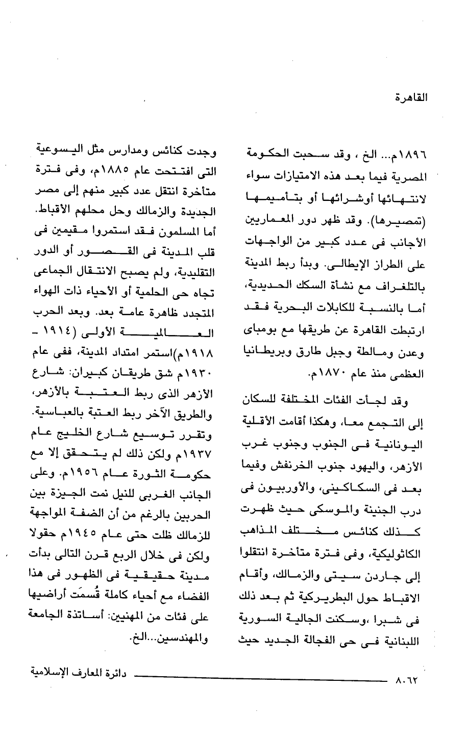 وقد لجأت الفئات المختلفة للسكان إلى التجمع معا، وهكذا أقامت الأقلية اليونانية فى الجنوب وجنوب غرب الأزهر، واليهود جنوب الخرنفش وفيما بعد فى السكاكينى، والأوربيون فى درب الجنينة والموسكى حيث ظهرت كذلك كنائس مختلف المذاهب الكاثوليكية، وفى فترة متأخرة انتقلوا إلى جاردن سيتى والزمالك، وأقام الاقباط حول البطريركية ثم بعد ذلك فى شبرا، وسكنت الجالية السورية اللبنانية فى حى الفجالة الجديد حيث وجدت كنائس ومدارس مثل اليسوعية التى افتتحت عام 1885 م، وفى فترة متأخرة انتقل عدد كبير منهم إلى مصر الجديدة والزمالك وحل محلهم الأقباط. أما المسلمون فقد استمروا مقيمين فى قلب المدينة فى القصور أو الدور التقليدية، ولم يصبح الانتقال الجماعى تجاه حى الحلمية أو الأحياء ذات الهواء المتجدد ظاهرة عامة بعد. وبعد الحرب العالمية الأولى (1914 - 1918 م) استمر امتداد المدينة، ففى عام 1930 م شق طريقان كبيران: شارع الأزهر الذى ربط العتبة بالأزهر، والطريق الآخر ربط العتبة بالعباسية. وتقرر توسيع شارع الخليج عام 1937 م ولكن ذلك لم يتحقق إلا مع حكومة الثورة عام 1956 م. وعلى الجانب الغربى للنيل نمت الجيزة بين الحربين بالرغم من أن الضفة المواجهة للزمالك ظلت حتى عام 1945 م حقولا ولكن فى خلال الربع قرن التالى بدأت مدينة حقيقية فى الظهور فى هذا الفضاء مع أحياء كاملة قُسمَت أراضيها على فئات من المهنيين: أساتذة الجامعة والمهندسين. . . إلخ.