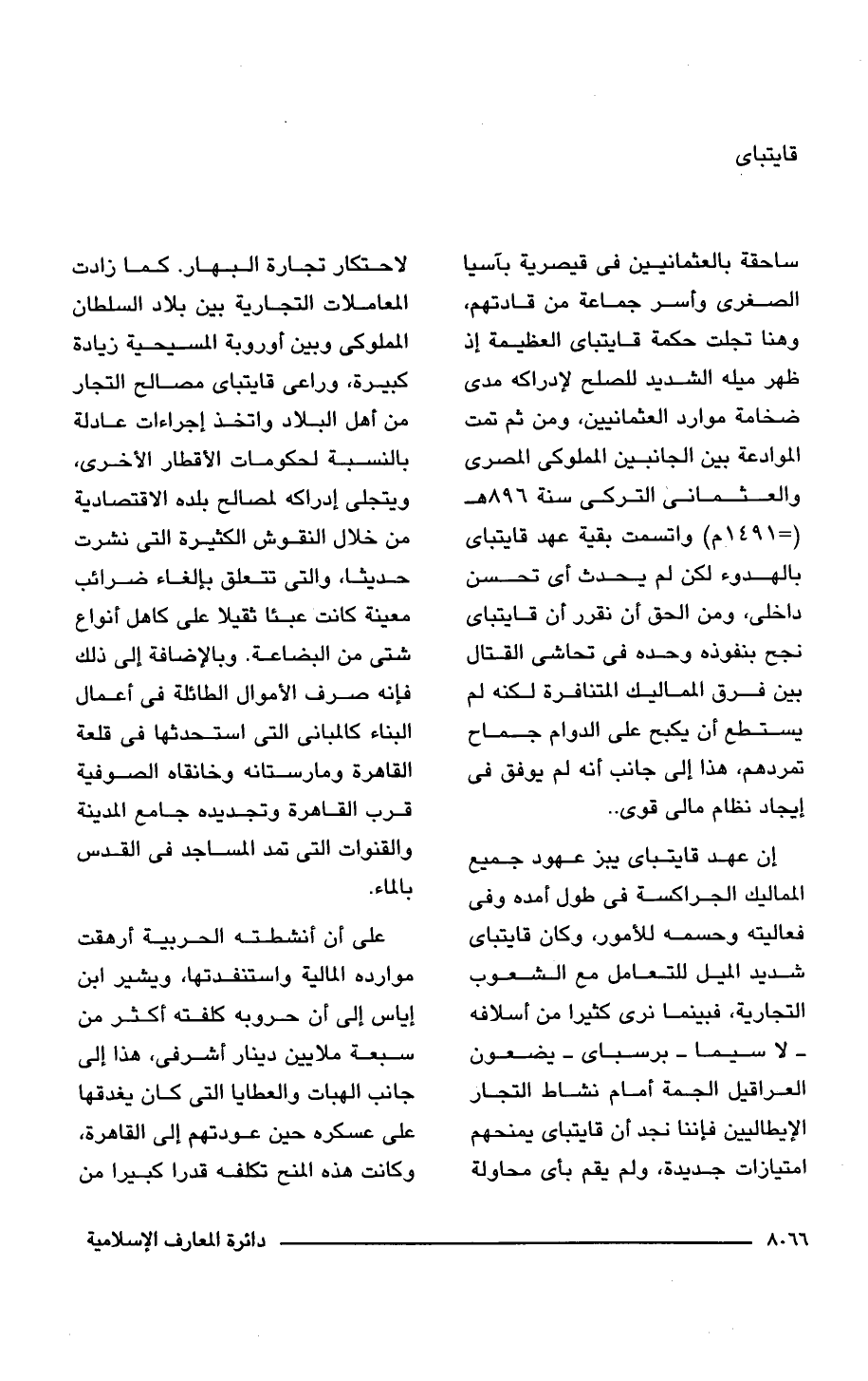 ساحقة بالعثمانيين فى قيصرية بآسيا الصغرى وأسر جماعة من قادتهم، وهنا تجلت حكمة قايتباى العظيمة إذ ظهر ميله الشديد للصلح لإدراكه مدى ضخامة موارد العثمانيين، ومن ثم تمت الموادعة بين الجانبين المملوكى المصرى والعثمانى التركى سنة 896 هـ (= 1491 م) واتسمت بقية عهد قايتباى بالهدوء لكن لم يحدث أى تحسن داخلى، ومن الحق أن نقرر أن قايتباى نجح بنفوذه وحده فى تحاشى القتال بين فرق المماليك المتنافرة لكنه لم يستطع أن يكبح على الدوام جماح تمردهم، هذا إلى جانب أنه لم يوفق فى إيجاد نظام مالى قوى. .