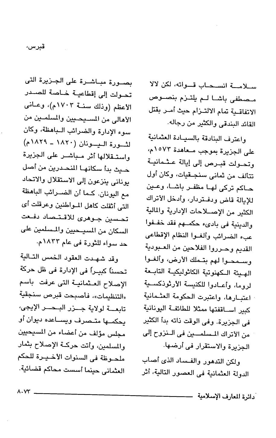 واعترف البنادقة بالسيادة العثمانية على الجزيرة بموجب معاهدة 1573 م، وتحولت قبرص إلى إيالة عثمانية تتألف من ثمانى سنجقيات، وكان أول حاكم تركى لها مظفر باشا، وعين للإيالة قاض ودفتردار، وأدخل الأتراك الكثير من الإصلاحات الإدارية والمالية والدينية فى بادئ حكمهم فقد خففوا عبء الضرائب وألغوا النظام الإقطاعى القديم وحرروا الفلاحين من العبودية وسمحوا لهم بتملك الأرض، وألغوا الهيئة الكهنوتية الكاثوليكية التابعة لروما، وأعادوا للكنيسة الأرثوذكسية اعتبارها، واعتبرت الحكومة العثمانية كبير أساقفتها ممثل للطائفة اليونانية فى الجزيرة. وفى الوقت ذاته بدأ الكثير من الأتراك المسلمين فى النزوح إلى الجزيرة والاستقرار فى أرضها.