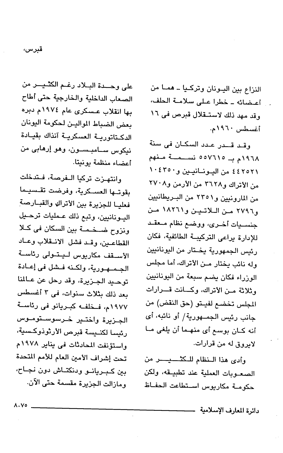 وقد قدر عدد السكان فى سنة 1968 م بـ 556715 نسمة منهم 442521 من اليونانيين و 104350 من الأتراك و 3628 من الأرمن و 2708 من المارونيين و 2351 من البريطانيين و 2769 من اللاتين و 18261 من جنسيات أخرى، ووضع نظام معقد للإدارة يراعى التركيبة الطائفية، فكان رئيس الجمهورية يختار من اليونانيين وله نائب يختار من الأتراك، أما مجلس الوزراء فكان يضم سبعة من اليونانيين وثلاثة من الأتراك، وكانت قرارات المجلس تخضع لفيتو (حق النقض) من جانب رئيس الجمهورية/ أو نائبه، أى أنه كان بوسع أى منهما أن يلغى ما لا يروق له من قرارات.