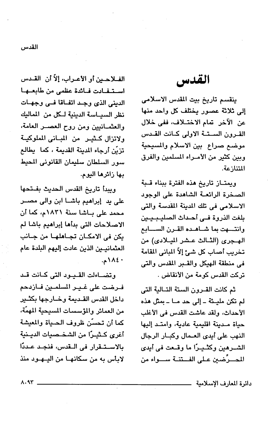 ويمتاز تاريخ هذه الفترة ببناء قبة الصخرة الرائعة الشاهدة على الوجود الإسلامى فى تلك المدينة المقدسة والتى بلغت الذروة فى أحداث الصليبيين وانتهت بما شاهده القرن السابع الهجرى (الثالث عشر الميلادى) من تخريب أصاب كل شئ إلّا المبانى المقامة فى منطقة الهيكل والقبر المقدس والتى تركت القدس كومة من الأنقاض.