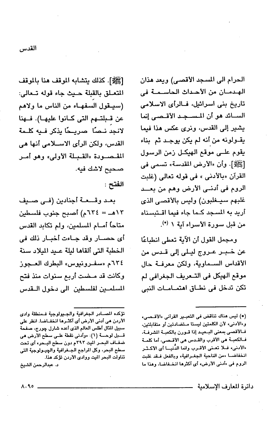 (*) ليس هناك تناقض فى التعبير القرآنى "الأقصى" و"الأدنى" لأن الكلمتين ليستا متضادتين أو متقابلتين، فالأقصى بمعنى البعيد إذا قورن بالكعبة المشرفة. فالكعبة هى الأقرب والقدس هى الأقصى، أما كلمة "الأدنى" فلا تعنى الأقرب وإنما الدُّنيا أى الأكثر انخفاضًا "من الناحية الجغرافية" وبالفعل فقد غلبت الروم فى "أدنى الأرض" أى أكثرها انخفاضًا، وهذا ما تؤكده المصادر الجغرافية والجيولوجية فمنطقة وادى الأردن هى أدنى الأرض أى أكثرها انخفاضًا. انظر على سبيل المثال أطلس العالم الذى أعده شارل جورج، صفحة قبل لوحة (1): "وأدنى نقطة على سطح الأرض هى ضفاف البحر الميت 393 هـ دون سطح البحر" أى تحت سطح البحر، وكل المراجع الجغرافية والجيولوجية التى تناولت البحر الميت ووادى الأردن تؤكد هذا.
