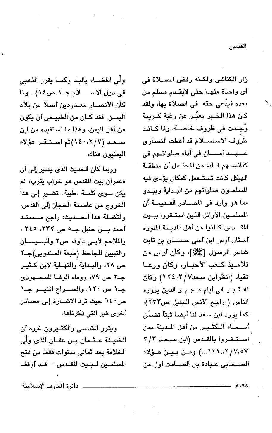 زار الكنائس ولكنه رفض الصلاة فى أى واحدة منها حتى لا يقدم مسلم من بعده فيدّعى حقه فى الصلاة بها، ولقد كان هذا الخبر يعبّر عن رغبة كريمة وُجِدت فى ظروف خاصة، ولما كانت ظروف الاستسلام قد أعطت النصارى عهد أمان فى أداء صلواتهم فى كنائسهم فإنه من المحتمل أن منطقة الهيكل كانت تستعمل كمكان يؤدى فيه المسلمون صلواتهم من البداية ويبدو مما هو وارد فى المصادر القديمة أن المسلمين الأوائل الذين استقروا ببيت المقدس كانوا من المدينة المنورة أمثال أوس ابن أخى حسان بن ثابت شاعر الرسول [-صلى اللَّه عليه وسلم-]، وكان أوس من تلاميذ كعب الأحبار، وكان ورعا تقيا، (انظر ابن سعد 7/ 2، 142) وكان له قبر فى أيام مجير الدين يزوره الناس (راجع الأنس الجليل ص 233)، كما يورد ابن سعد لنا أيضًا ثبتًا تضمّن أسماء الكثير من أهل المدينة ممن استقروا بالقدس (ابن سعد 3/ 3، 57، 7/ 2، 129. . .) ومن بين هؤلاء الصحابى عبادة بن الصامت أول من ولِّى القضاء بالبلد وكما يقرر الذهبى فى دول الإسلام جـ 1 ص 14). ولما كان الأنصار معدودين أصلا من بلاد اليمن فقد كان من الطبيعى أن يكون من أهل اليمن، وهذا ما نستفيده من ابن سعد (7/ 2، 140) ثم استقر هؤلاء اليمنيون هناك.