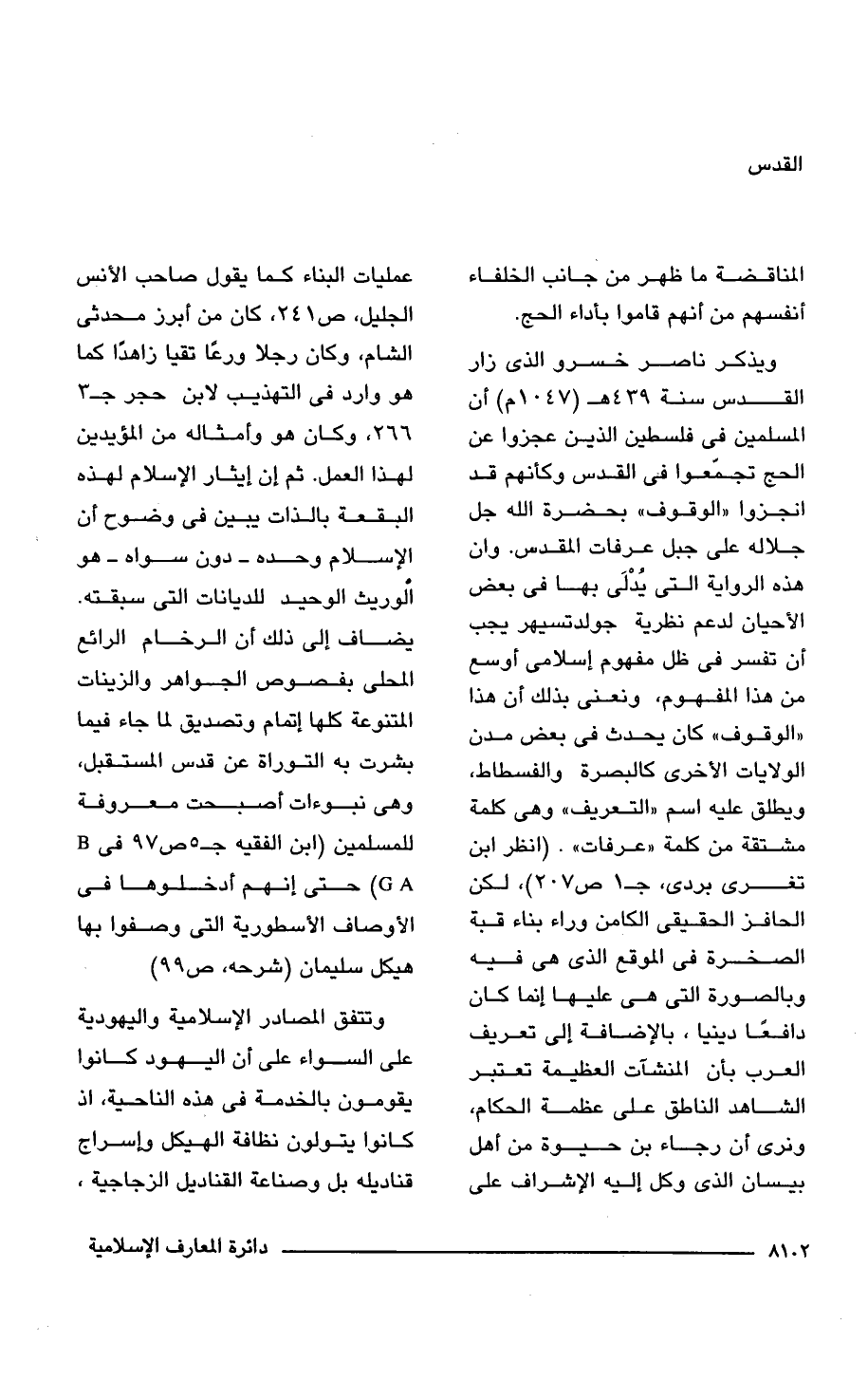 ويذكر ناصر خسرو الذى زار القدس سنة 439 هـ (1047 م) أن المسلمين فى فلسطين الذين عجزوا عن الحج تجمَّعوا فى القدس وكأنهم قد انجزوا "الوقوف" بحضرة اللَّه جل جلاله على جبل عرفات المقدس. وإن هذه الرواية التى يُدْلَى بها فى بعض الأحيان لدعم نظرية جولدتسيهر يجب أن تفسر فى ظل مفهوم إسلامى أوسع من هذا المفهوم، ونعنى بذلك أن هذا "الوقوف" كان يحدث فى بعض مدن الولايات الأخرى كالبصرة والفسطاط، ويطلق عليه اسم "التعريف" وهى كلمة مشتقة من كلمة "عرفات". (انظر ابن تغرى بردى، جـ 1 ص 207)، لكن الحافز الحقيقى الكامن وراء بناء قبة الصخرة فى الموقع الذى هى فيه وبالصورة التى هى عليها إنما كان دافعًا دينيًا، بالإضافة إلى تعريف العرب بأن المنشآت العظيمة تعتبر الشاهد الناطق على عظمة الحكام، ونرى أن رجاء بن حيوة من أهل بيسان الذى وكل إليه الإشراف على عمليات البناء كما يقول صاحب الأنس الجليل، ص 241، كان من أبرز محدثى الشام، وكان رجلًا ورعًا تقيًا زاهدًا كما هو وارد فى التهذيب لابن حجر جـ 3 ص 266. وكان هو وأمثاله من المؤيدين لهذا العمل. ثم إن إيثار الإسلام لهذه البقعة بالذات يبين فى وضوح أن الإسلام وحده -دون سواه- هو الوريث الوحيد للديانات التى سبقته. يضاف إلى ذلك أن الرخام الرائع المحلى بفصوص الجواهر والزينات المتنوعة كلها إتمام وتصديق لما جاء فيما بشرت به التوراة عن قدس المستقبل، وهى نبوءات أصبحت معروفة للمسلمين (ابن الفقيه جـ 5 ص 97 فى BGA) حتى إنهم أدخلوها فى الأوصاف الأسطورية التى وصفوا بها هيكل سليمان (شرحه، ص 99)