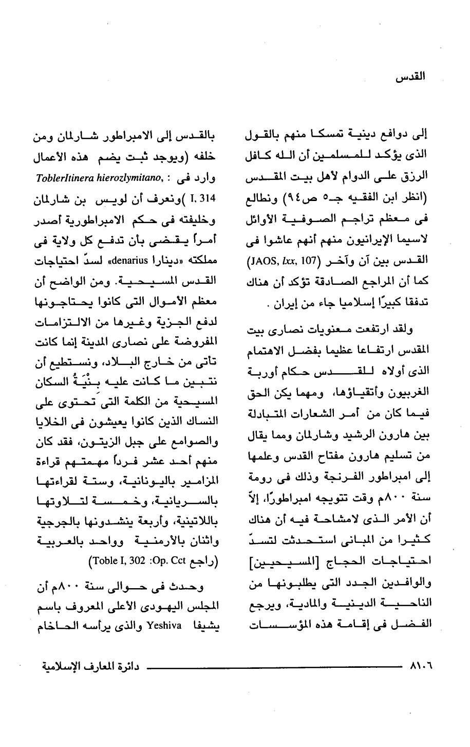 إلى دوافع دينية تمسكا منهم بالقول الذى يؤكد للمسلمين أن اللَّه كافل الرزق على الدوام لأهل بيت المقدس (انظر ابن الفقيه جـ 5 ص 94) ونطالع فى معظم تراجم الصوفية الأوائل لاسيما الايرانيون منهم أنهم عاشوا فى القدس بين آنٍ وآخر (JAOS, lxx, 107) كما أن المراجع الصادقة تؤكد أن هناك تدفقا كبيرًا إسلاميا جاء من إيران.