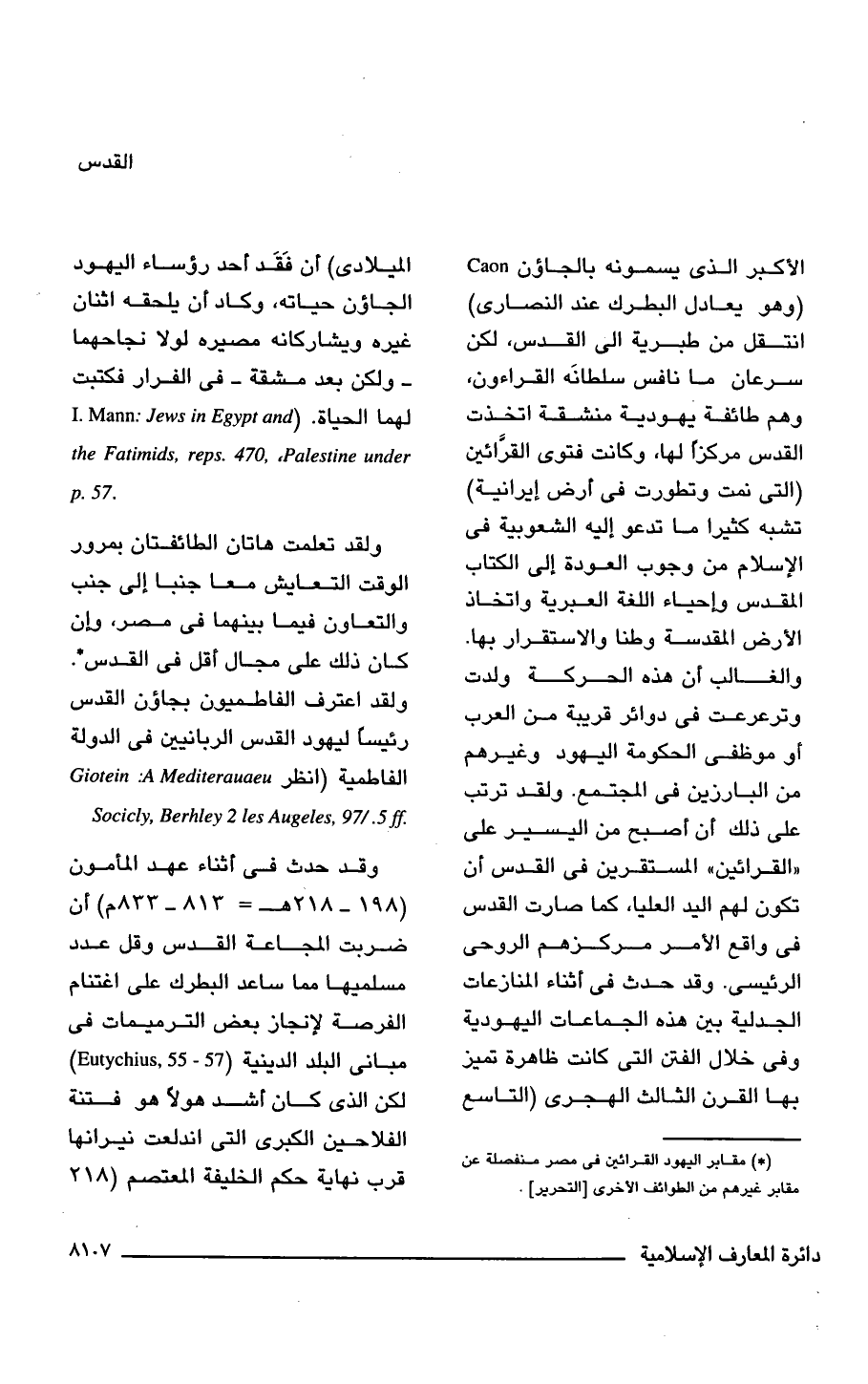 الأكبر الذى يسمونه بالجاؤن Caon (وهو يعادل البطرك عند النصارى) انتقل من طبرية إلى القدس، لكن سرعان ما نافس سلطانه القراءون، وهم طائفة يهودية منشقة اتخذت القدس مركزًا لها، وكانت فتوى القرَّائين (التى نمت وتطورت فى أرض إيرانية) تشبه كثيرًا ما تدعو إليه الشعوبية فى الإسلام من وجوب العودة إلى الكتاب المقدس وإحياء اللغة العبرية واتخاذ الأرض المقدسة وطنًا والاستقرار بها. والغالب أن هذه الحركة ولدت وترعرعت فى دوائر قريبة من العرب أو موظفى الحكومة اليهود وغيرهم من البارزين فى المجتمع. ولقد ترتب على ذلك أن أصبح من اليسير على "القرائين" المستقرين فى القدس أن تكون لهم اليد العليا، كما صارت القدس فى واقع الأمر مركزهم الروحى الرئيسى. وقد حدث فى أثناء المنازعات الجدلية بين هذه الجماعات اليهودية وفى خلال الفتن التى كانت ظاهرة تميز بها القرن الثالث الهجرى (التاسع الميلادى) أن فَقَد أحد رؤساء اليهود الجاؤن حياته، وكاد أن يلحقه اثنان غيره ويشاركانه مصيره لولا نجاحهما -ولكن بعد مشقة- فى الفرار فكتبت لهما الحياة. (I. Mann: Jews in Egypt and the Fatimids, reps.470, Palestine under p.57