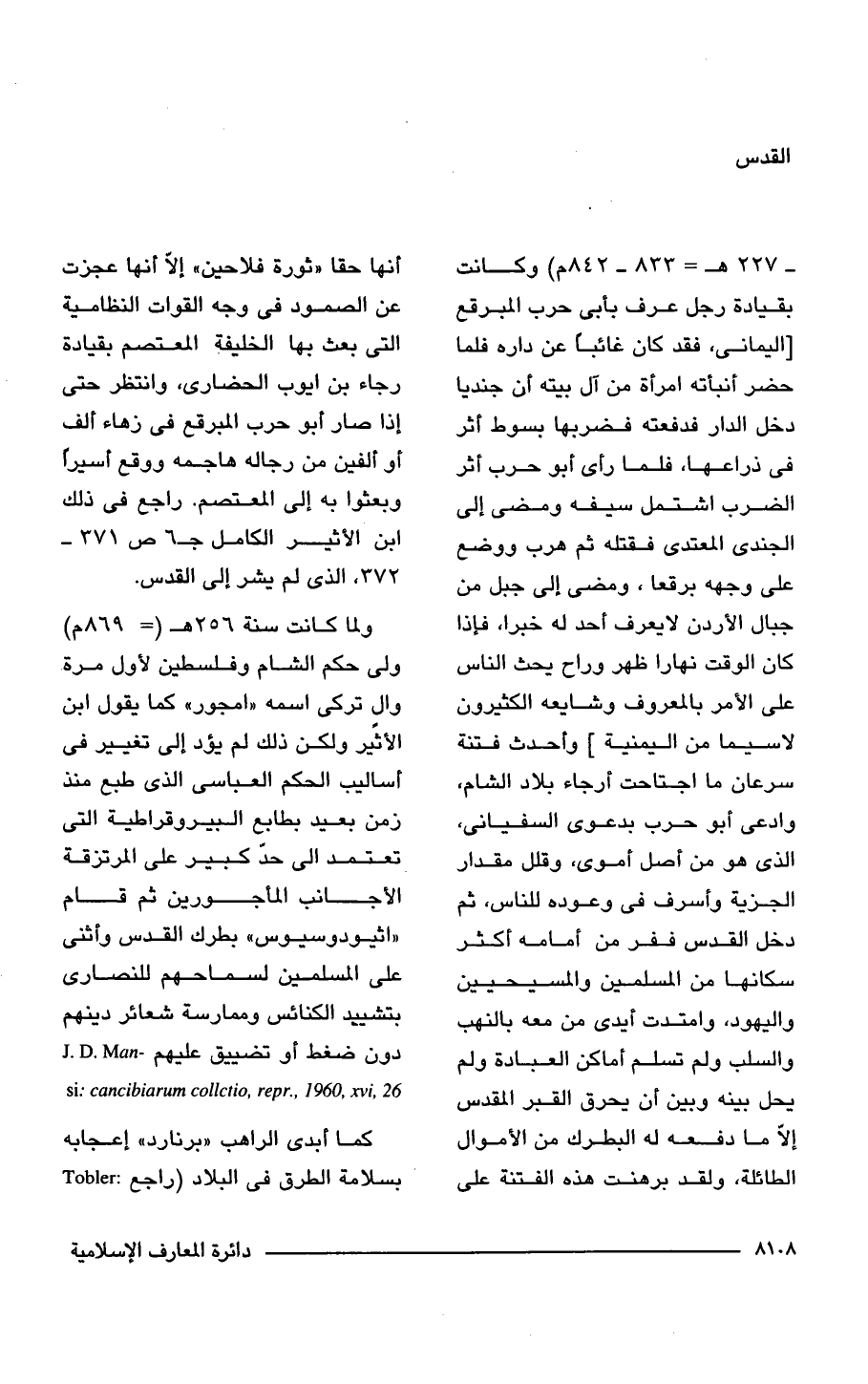 - 227 هـ = 833 - 842 م) وكانت بقيادة رجل عرف بأبى حرب المبرقع [اليمانى، فقد كان غائبًا عن داره فلما حضر أنبأته امرأة من آل بيته أن جنديا دخل الدار فدفعته فضربها بسوط أثر فى ذراعها، فلما رأى أبو حرب أثر الضرب اشتمل سيفه ومضى إلى الجندى المعتدى فقتله ثم هرب ووضع على وجهه برقعا، ومضى إلى جبل من جبال الأردن لا يعرف أحد له خبرًا، فإذا كان الوقت نهارًا ظهر وراح يحث الناس على الأمر بالمعروف وشايعه الكثيرون لاسيما من اليمنية] وأحدث فتنة سرعان ما اجتاحت أرجاء بلاد الشام، وادعى أبو حرب بدعوى السفيانى، الذى هو من أصل أموى، وقلل مقدار الجزية وأسرف فى وعوده للناس، ثم دخل القدس ففر من أمامه أكثر سكانها من المسلمين والمسيحيين واليهود، وامتدت أيدى من معه بالنهب والسلب ولم تسلم أماكن العبادة ولم يحل بينه وبين أن يحرق القبر المقدس إلّا ما دفعه له البطرك من الأموال الطائلة، ولقد برهنت هذه الفتنة على أنها حقا "ثورة فلاحين" إلا أنها عجزت عن الصمود فى وجه القوات النظامية التى بعث بها الخليفة المعتصم بقيادة رجاء بن ايوب الحضارى، وانتظر حتى إذا صار أبو حرب المبرقع فى زهاء ألف أو ألفين من رجاله هاجمه ووقع أسيرًا وبعثوا به إلى المعتصم. راجع فى ذلك ابن الأثير الكامل جـ 6 ص 371 - 372. الذى لم يشر إلى القدس.