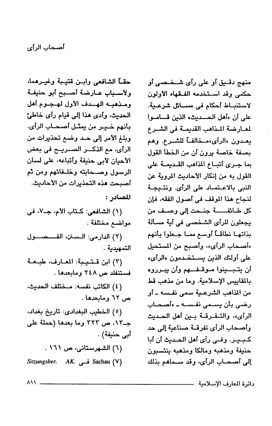 منهج دقيق أو على رأى شخصى أو حكمى وقد استخدهه الفقهاء الأولون لاستنباط أحكام فى مسائل شرعية. على أن "أهل الحديث" الذين قاموا لمعارضة المذاهب القديمة فى الشرع يعدون "الرأى"مخالفًا للشرع. وهم بصفة خاصة يرون أن من الخطأ القول بما جرى أتباع المذاهب القديمة على القول به من إنكار الأحاديث المروية عن النبى بالاعتماد على الرأى. ونتيجة لنجاح هذا الموقف فى أصول الفقه، فإن كل طائفة جنحت إلى وصف من يجعلون للرأى الشخصى فى أية مسألة بذاتها نطاقًا أوسع مما جعلوا بأنهم "أصحاب الرأى" وأصبح من المستحيل على أولئك الذين يستخدمون "الرأى" أن يتبينوا موقفهم وأن يبرروه بالمقاييس الإسلامية. وما من مذهب قط من المذاهب الشرعية سمى نفسه -أو رضى بأن يسمى نفسه- "أصحاب الرأى"، والتفرقة بين أهل الحديث وأصحاب الرأى تفرقة صناعية إلى حد كبير. وفى رأى أهل الحديث أن أبا حنيفة ومذهبه ومالكا ومذهبه ينتسبون إلى أصحاب الرأى، وقد سماهم بذلك حقا الشافعى وابن قتيبة وغيرهما، ولأسباب عارضة أصبح أبو حنيفة ومذهبه الهدف الأول لهجوم أهل الحديث، وأدى هذا إلى قيام رأى خاطئ بأنهم خير من يمثل أصحاب الرأى. وبلغ الأمر إلى حد وضع تحذيرات من الرأى، مع الذكر الصريح فى بعض الأحيان لأبى حنيفة وأتباعه، على لسان الرسول وصحابته وخلفائهم ومن ثم أصبحت هذه التحذيرات من الأحاديث.