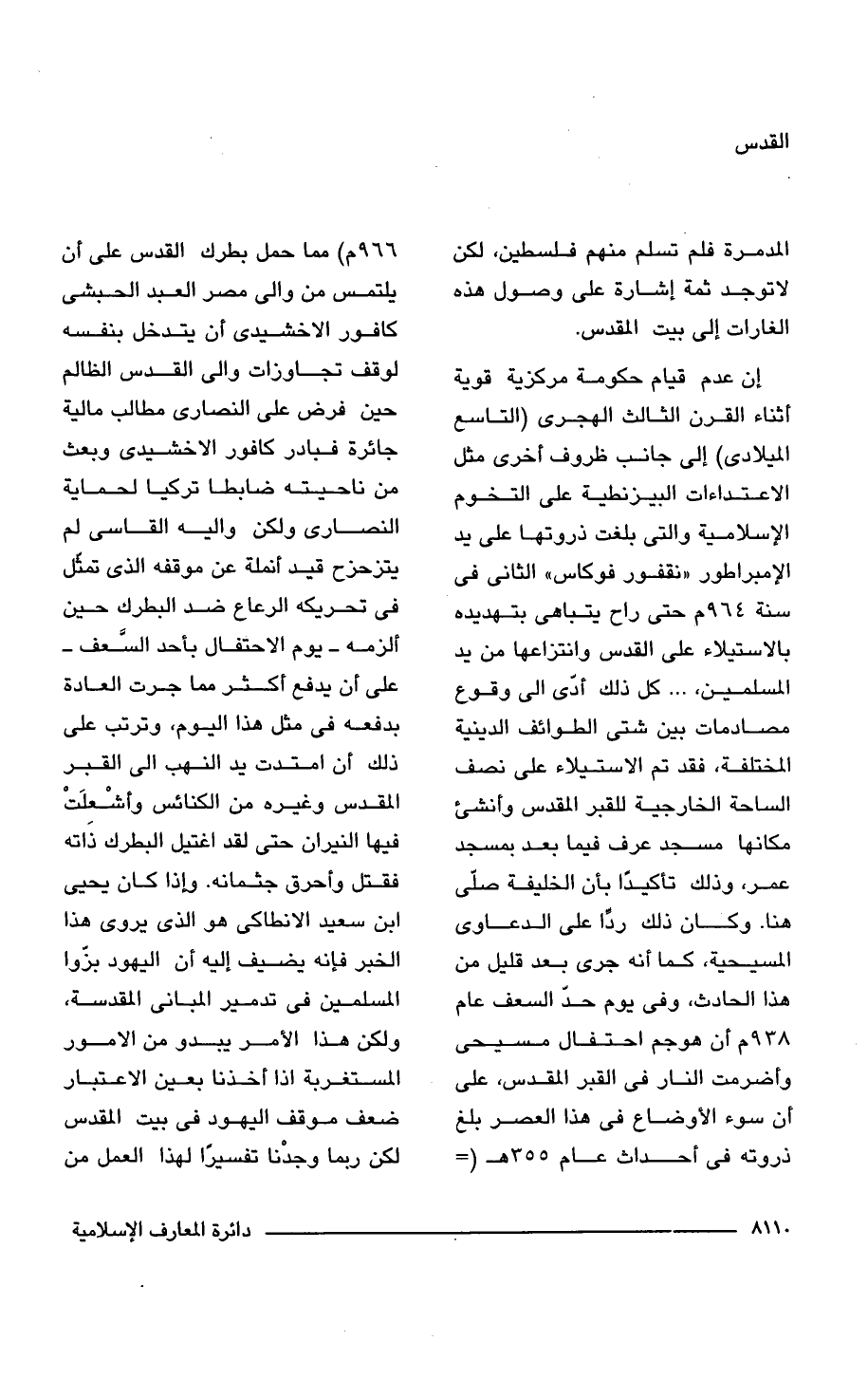 إن عدم قيام حكومة مركزية قوية أثناء القرن الثالث الهجرى (التاسع الميلادى) إلى جانب ظروف أخرى مثل الاعتداءات البيزنطية على التخوم الإسلامية والتى بلغت ذروتها على يد الإمبراطور "نقفور فوكاس" الثانى فى سنة 964 م حتى راح يتباهى بتهديده بالاستيلاء على القدس وانتزاعها من يد المسلمين، . . . كل ذلك أدّى إلى وقوع مصادمات بين شتى الطوائف الدينية المختلفة، فقد تم الاستيلاء على نصف الساحة الخارجية للقبر المقدس وأنشئ مكانها مسجد عرف فيما بعد بمسجد عمر، وذلك تأكيدًا بأن الخليفة صلَّى هنا. وكان ذلك ردًا على الدعاوى المسيحية، كما أنه جرى بعد قليل من هذا الحادث، وفى يوم حدّ السعف عام 938 هـ, أن هوجم احتفال مسيحى وأضرمت النار فى القبر المقدس، على أن سوء الأوضاع فى هذا العصر بلغ ذروته فى أحداث عام 355 هـ (= 966 م) مما حمل بطرك القدس على أن يلتمس من والى مصر العبد الحبشى كافور الاخشيدى أن يتدخل بنفسه لوقف تجاوزات والى القدس الظالم حين فرض على النصارى مطالب مالية جائرة فبادر كافور الاخشيدى وبعث من ناحيته ضابطا تركيا لحماية النصارى ولكن واليه القاسى لم يتزحزح قيد أنملة عن موقفه الذى تمثل فى تحريكه الرعاع ضد البطرك حين ألزمه -يوم الاحتفال بأحد السَّعف- على أن يدفع أكثر مما جرت العادة بدفعه فى مثل هذا اليوم، وترتب على ذلك أن امتدت يد النهب إلى القبر المقدس وغيره من الكنائس وأشْعِلَتْ فيها النيران حتى لقد اغتيل البطرك ذاته فقتل وأحرق جثمانه. وإذا كان يحيى ابن سعيد الانطاكى هو الذى يروى هذا الخبر فإنه يضيف إليه أن اليهود بزّوا المسلمين فى تدمير المبانى المقدسة، ولكن هذا الأمر يبدو من الأمور المستغربة إذا أخذنا بعين الاعتبار ضعف موقف اليهود فى بيت المقدس لكن ربما وجدنا تفسيرًا لهذا العمل من