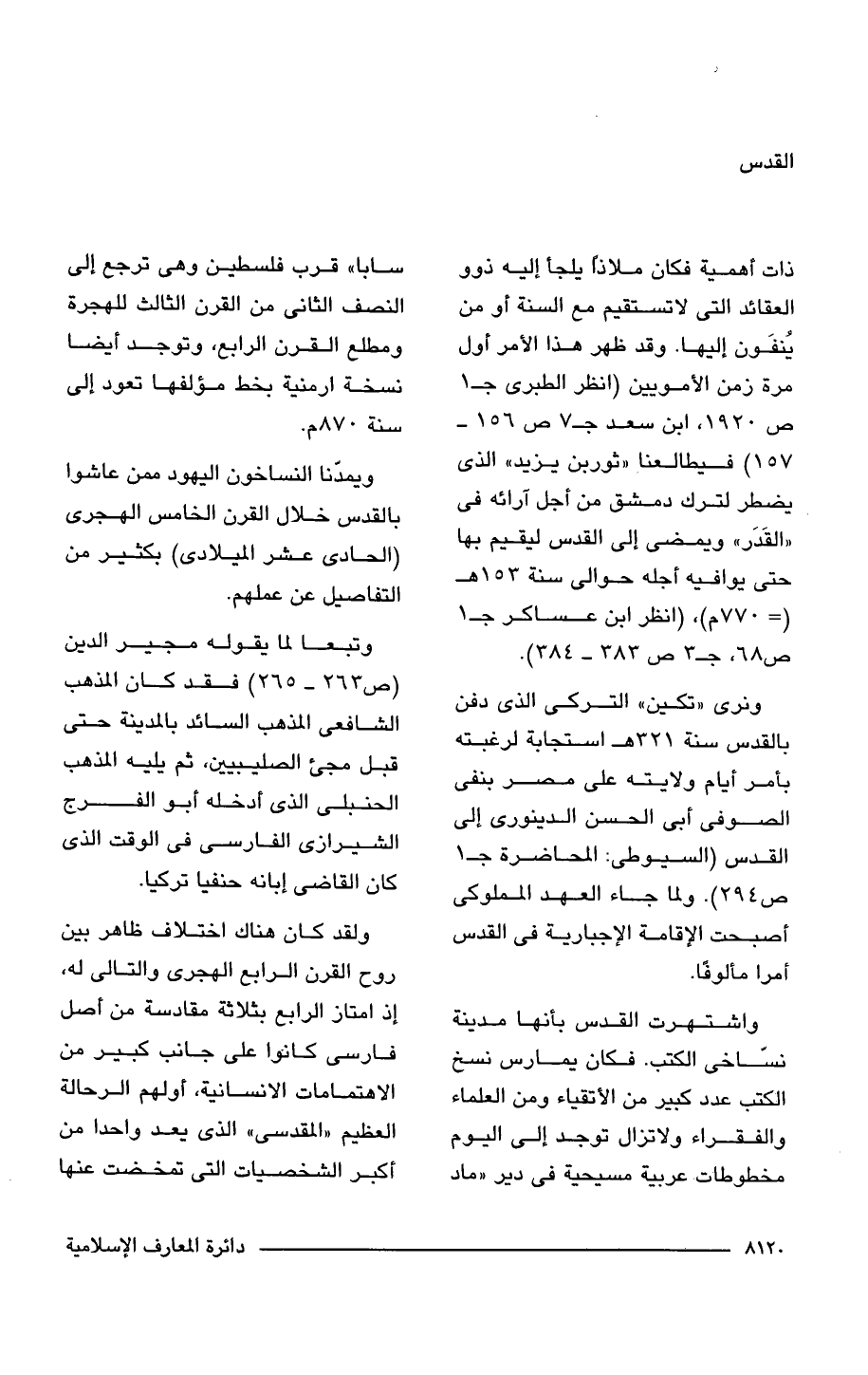 ذات أهمية فكان ملاذًا يلجأ إليه ذوو العقائد التى لا تستقيم مع السنة أو من يُنفَون إليها. وقد ظهر هذا الأمر أول مرة زمن الأمويين (انظر الطبرى جـ 1 ص 1920, ابن سعد جـ 7 ص 156 - 157) فيطالعنا " ثور بن يزيد" الذى يضطر لترك دمشق من أجل آرائه فى "القَدَر" ويمضى إلى القدس ليقيم بها حتى يوافيه أجله حوالى سنة 153 هـ (= 770 م)، (انظر ابن عساكر جـ 1 ص 68، جـ 3 ص 383 - 384).