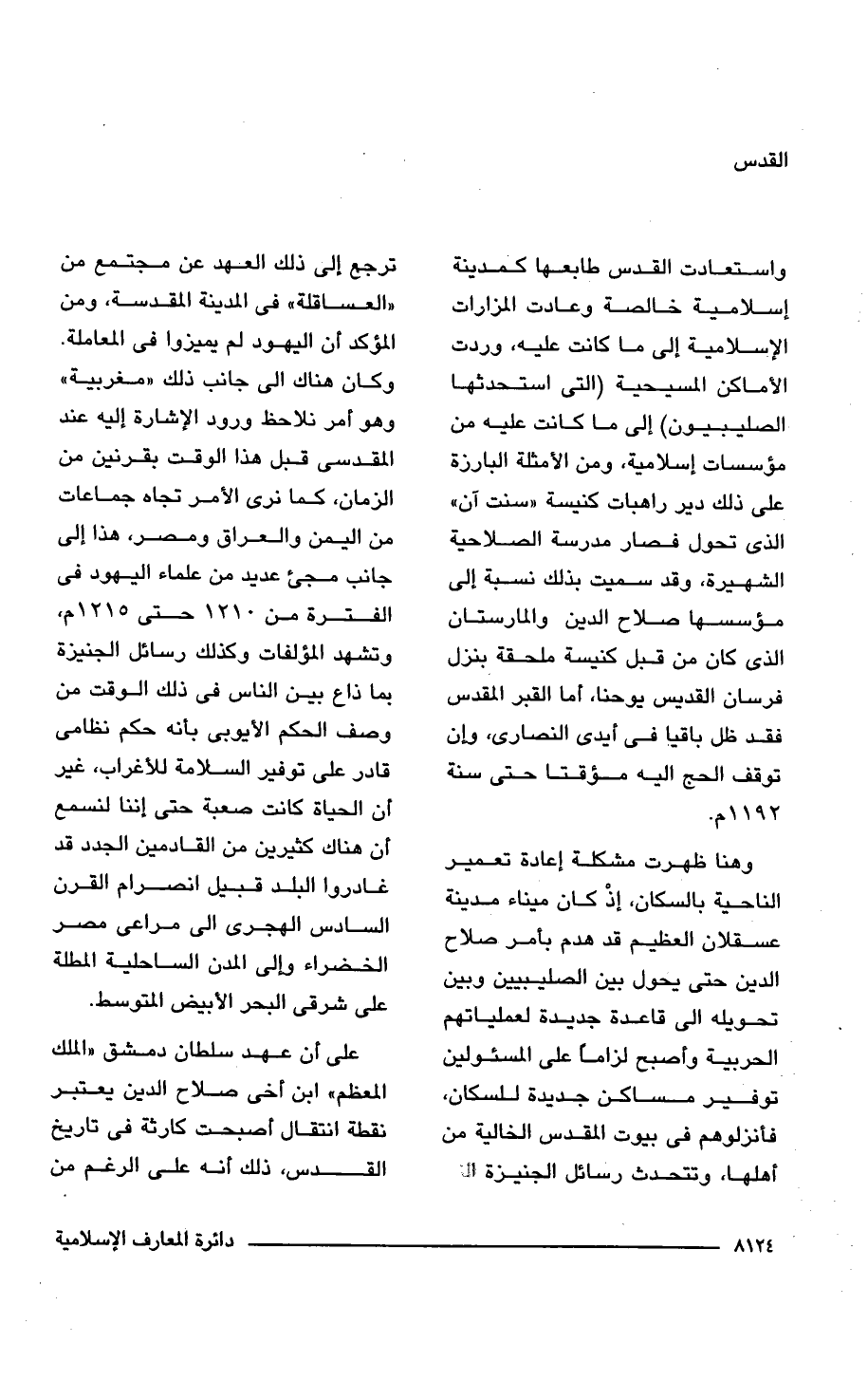 واستعادت القدس طابعها كمدينة إسلامية خالصة وعادت المزاوات الإسلامية إلى ما كانت عليه، وردت الأماكن المسيحية (التى استحدثها الصليبيون) إلى ما كانت عليه من مؤسسات إسلامية، ومن الأمثلة البارزة على ذلك دير راهبات كنيسة "سنت آن" الذى تحول فصار مدرسة الصلاحية الشهيرة، وقد سميت بذلك نسبة إلى مؤسسها صلاح الدين والمارستان الذى كان من قبل كنيسة ملحقة بنزل فرسان القديس يوحنا، أما القبر المقدس فقد ظل باقيًا فى أيدى النصارى، وإن توقف الحج إليه مؤقتًا حتى سنة 1192 م.