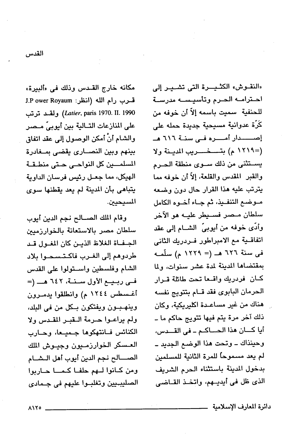 "النقوش" الكثيرة التى تشير إلى احترامه الحرم وتأسيسه مدرسة للحنفية سميت باسمه إلا أن خوفه من كَرّة عدوانية مسيحية جديدة حمله على إصدار أمره فى سنة 616 هـ (= 1219 م) بتخريب المدينة ولا يستثنى من ذلك سوى منطقة الحرم والقبر المقدس والقلعة، إلا أن خوفه مما يترتب عليه هذا القرار حال دون وضعه موضع التنفيذ، ثم جاء أخوه الكامل سلطان مصر فسيطر عليه هو الآخر وأدّى خوفه من أيوبىّ الشام إلى عقد اتفاقية مع الإمبراطور فردريك الثانى فى سنة 626 هـ (= 1229 م) سلّمه بمقتضاها المدينة لمدة عشر سنوات، ولما كان فردريك واقعًا تحت طائلة قرار الحرمان البابوى فقد قام بتتويج نفسه هناك من غير مساعدة اكليريكية، وكان ذلك آخر مرة يتم فيها تتويج حاكم ما -أيا كان هذا الحاكم- فى القدس، وحينذاك -وتحت هذا الوضع الجديد- لم يعد مسموحًا للمرة الثانية للمسلمين بدخول المدينة باستثناء الحرم الشريف الذى ظل فى أيديهم، واتخذ القاضى مكانه خارج القدس وذلك فى "ألبيرة" قرب رام اللَّه (انظر J.P ower Royaum: Latier, paris 1970. II. 1990) ولقد ترتب على المنازعات التالية بين أيوبىّ مصر والشام أنْ أمكن الوصول إلى عقد اتفاق بينهم وبين النصارى يقضى بمغادرة المسلمين كل النواحى حتى منطقة الهيكل، مما جعل رئيس فرسان الداوية يتباهى بأن المدينة لم يعد يقطنها سوى المسيحيين.