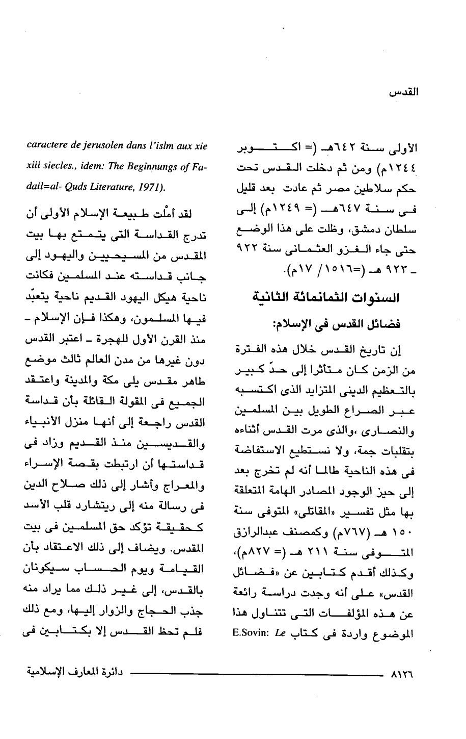 إن تاريخ القدس خلال هذه الفترة من الزمن كان متأثرًا إلى حدٍّ كبير بالتعظيم الدينى المتزايد الذى اكتسبه عبر الصراع الطويل بين المسلمين والنصارى، والذى مرت القدس أثناءه بتقلبات جمة، ولا نستطيع الاستفاضة فى هذه الناحية طالما أنه لم تخرج بعد إلى حيز الوجود المصادر الهامة المتعلقة بها مثل تفسير "المقاتلى" المتوفى سنة 150 هـ (767 م) وكمصنف عبد الرازق المتوفى سنة 211 هـ (= 827 م)، وكذلك أقدم كتابين عن "فضائل القدس" على أنه وجدت دراسة رائعة عن هذه المؤلفات التى تتناول هذا الموضوع واردة فى كتاب E.Sovin: Le caractere de jerusolen dans l'islm aux xie xiii siecles, idem: The Beginnungs of Fadail = al-Quds Literature, 1971)