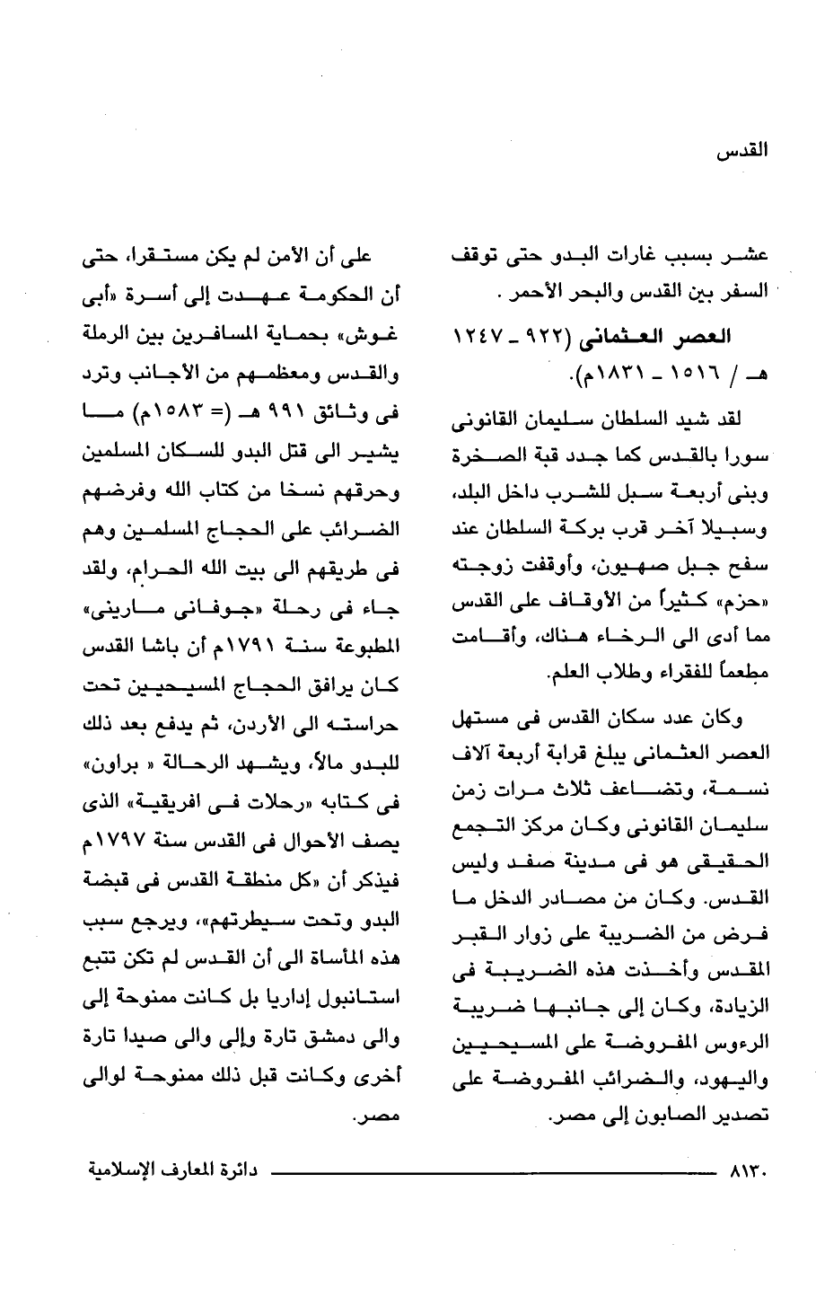 على أن الأمن لم يكن مستقرًا، حتى أن الحكومة عهدت إلى أسرة "أبى غوش" بحماية المسافرين بين الرملة والقدس ومعظمهم من الأجانب وترد فى وثائق 991 هـ (= 1583 م) ما يشير إلى قتل البدو للسكان المسلمين وحرقهم نسخًا من كتاب اللَّه وفرضهم الضرائب على الحجاج المسلمين وهم فى طريقهم إلى بيت اللَّه الحرام، ولقد جاء فى رحلة "جوفانى مارينى" المطبوعة سنة 1791 م أن باشا القدس كان يرافق الحجاج المسيحيين تحت حراسته إلى الأردن، ثم يدفع بعد ذلك للبدو مالًا، ويشهد الرحالة "براون" فى كتابه "رحلات فى إفريقية" الذى يصف الأحوال فى القدس سنة 1797 م فيذكر أن "كل منطقة القدس فى قبضة البدو وتحت سيطرتهم"، ويرجع سبب هذه المأساة إلى أن القدس لم تكن تتبع استانبول إداريًا بل كانت ممنوحة إلى والى دمشق تارة وإلى والى صيدا تارة أخرى وكانت قبل ذلك ممنوحة لوالى مصر.
