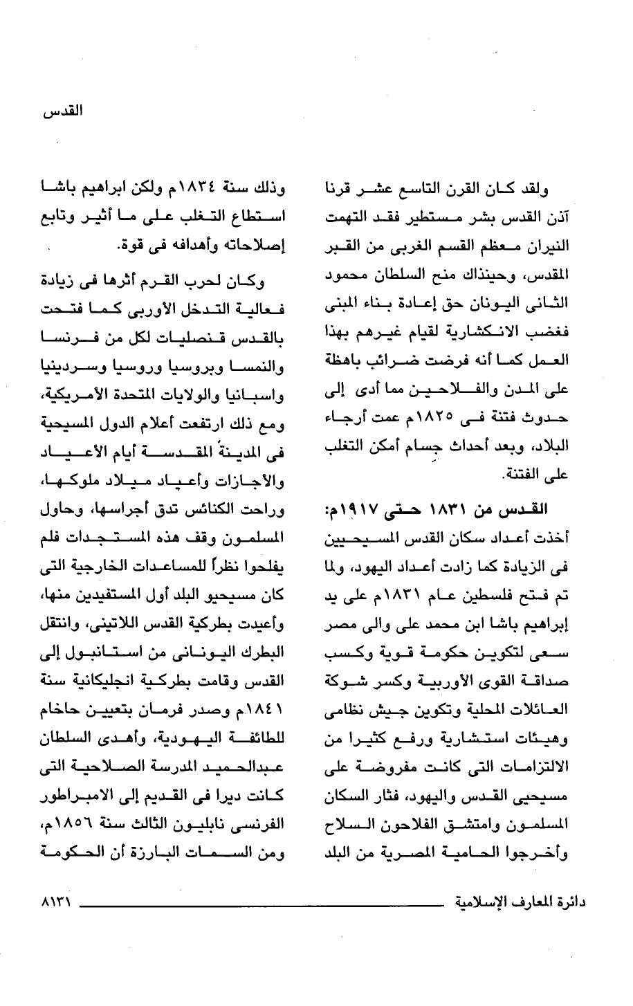 أخذت أعداد سكان القدس المسيحيين فى الزيادة كما زادت أعداد اليهود، ولما تم فتح فلسطين عام 1831 م على يد إبراهيم باشا ابن محمد على والى مصر سعى لتكوين حكومة قوية وكسب صداقة القوى الأوربية وكسر شوكة العائلات المحلية وتكوين جيش نظامى وهيئات استشارية ورفع كثيرًا من الالتزامات التى كانت مفروضة على مسيحيى القدس واليهود، فثار السكان المسلمون وامتشق الفلاحون السلاح وأخرجوا الحامية المصرية من البلد وذلك سنة 1834 م ولكن إبراهيم باشا استطاع التغلب على ما أثير وتابع إصلاحاته وأهدافه فى قوة.