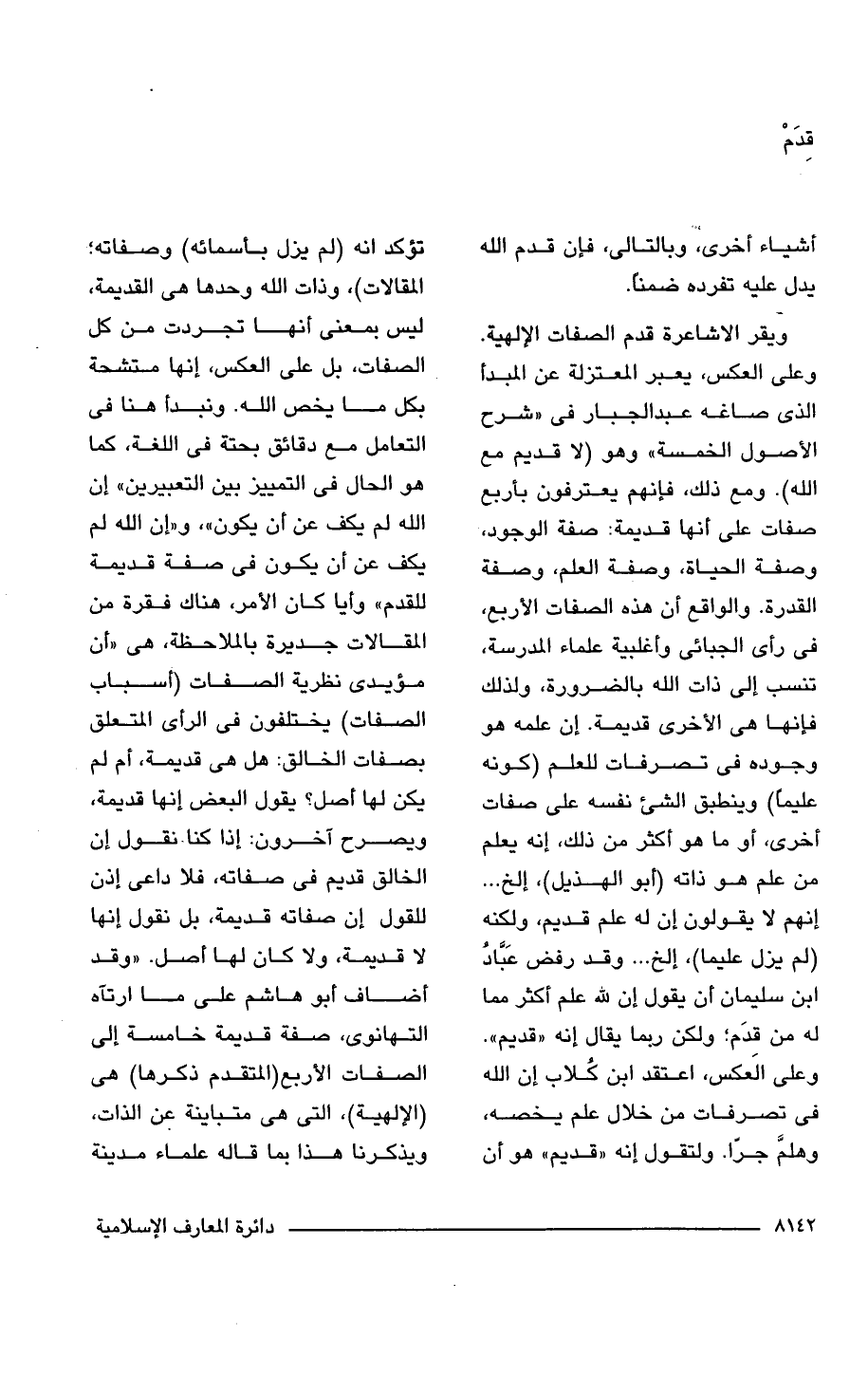 ويقر الاشاعرة قدم الصفات الإلهية. وعلى العكس، يعبر المعتزلة عن المبدأ الذى صاغه عبد الجبار فى "شرح الأصول الخمسة" وهو (لا قديم مع اللَّه). ومع ذلك، فإنهم يعترفون بأربع صفات على أنها قديمة: صفة الوجود، وصفة الحياة، وصفة العلم، وصفة القدرة. والواقع أن هذه الصفات الأربع، فى رأى الجبائى وأغلبية علماء المدرسة، تنسب إلى ذات اللَّه بالضرورة، ولذلك فإنها هى الأخرى قديمة. إن علمه هو وجوده فى تصرفات للعلم (كونه عليمًا) وينطبق الشئ نفسه على صفات أخرى، أو ما هو أكثر من ذلك، إنه يعلم من علم هو ذاته (أبو الهذيل)، إلخ. . . إنهم لا يقولون إن له علم قديم، ولكنه (لم يزل عليما)، إلخ. . . وقد رفض عَبَّادُ ابن سليمان أن يقول إن للَّه علم أكثر مما له من قِدَم؛ ولكن ربما يقال إنه "قديم". وعلى العكس، اعتقد ابن كُلاب إن اللَّه فى تصرفات من خلال علم يخصه، وهلمَّ جرًا. ولتقول إنه "قديم" هو أن تؤكد أنه (لم يزل بأسمائه) وصفاته؛ المقالات)، وذات اللَّه وحدها هى القديمة، ليس بمعنى أنها تجردت من كل الصفات، بل على العكس، إنها متشحة بكل ما يخص اللَّه. ونبدأ هنا فى التعامل مع دقائق بحتة فى اللغة، كما هو الحال فى التمييز بين التعبيرين "إن اللَّه لم يكف عن أن يكون"، و"إن اللَّه لم يكف عن أن يكون فى صفة قديمة للقدم" وأيا كان الأمر، هناك فقرة من المقالات جديرة بالملاحظة، هى "أن مؤيدى نظرية الصفات (أسباب الصفات) يختلفون فى الرأى المتعلق بصفات الخالق: هل هى قديمة، أم لم يكن لها أصل؟ يقول البعض إنها قديمة، ويصرح آخرون: إذا كنا نقول إن الخالق قديم فى صفاته، فلا داعى إذن للقول إن صفاته قديمة، بل نقول إنها لا قديمة، ولا كان لها أصل. "وقد أضاف أبو هاشم على ما ارتآه التهانوى، صفة قديمة خامسة إلى الصفات الأربع (المتقدم ذكرها) هى (الإلهية)، التى هى متباينة عن الذات، ويذكرنا هذا بما قاله علماء مدينة