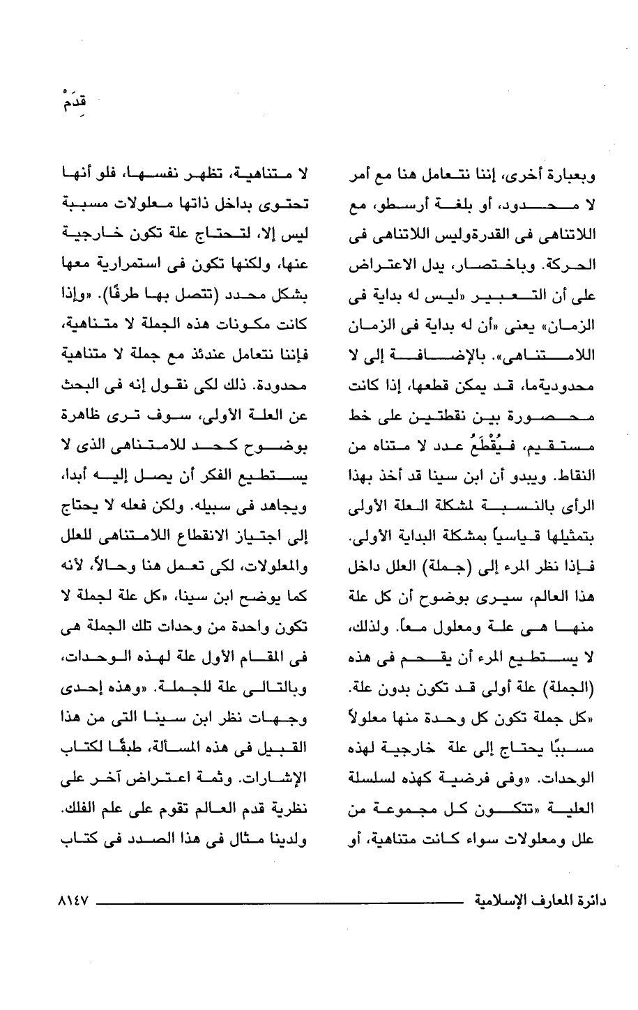وبعبارة أخرى، إننا نتعامل هنا مع أمر لا محدود، أو بلغة أرسطو، مع اللاتناهى فى القدرة وليس اللاتناهى فى الحركة. وباختصار، يدل الاعتراض على أن التعبير "ليس له بداية فى الزمان" يعنى "أن له بداية فى الزمان اللامتناهى". بالإضافة إلى لا محدودية ما، قد يمكن قطعها، إذا كانت محصورة بين نقطتين على خط مستقيم، فيُقْطَعُ عدد لا متناه من النقاط. ويبدو أن ابن سينا قد أخذ بهذا الرأى بالنسبة لمشكلة العلة الأولى بتمثيلها قياسيًا بمشكلة البداية الأولى. فإذا نظر المرء إلى (جملة) العلل داخل هذا العالم، سيرى بوضوح أن كل علة منها هى علة ومعلول معًا. ولذلك، لا يستطيع المرء أن يقحم فى هذه (الجملة) علة أولى قد تكون بدون علة. "كل جملة تكون كل وحدة منها معلولًا مسببًا يحتاج إلى علة خارجية لهذه الوحدات. "وفى فرضية كهذه لسلسلة العلية" تتكون كل مجموعة من علل ومعلولات سواء كانت متناهية، أو لا متناهية، تظهر نفسها، فلو أنها تحتوى بداخل ذاتها معلولات مسببة ليس إلا، لتحتاج علة تكون خارجية عنها، ولكنها تكون فى استمرارية معها بشكل محدد (تتصل بها طرفًا). "وإذا كانت مكونات هذه الجملة لا متناهية، فإننا نتعامل عندئذ مع جملة لا متناهية محدودة. ذلك لكى نقول إنه فى البحث عن العلة الأولى، سوف ترى ظاهرة بوضوح كحد للامتناهى الذى لا يستطيع الفكر أن يصل إليه أبدا، ويجاهد فى سبيله. ولكن فعله لا يحتاج إلى اجتياز الانقطاع اللامتناهى للعلل والمعلولات، لكى تعمل هنا وحالًا، لأنه كما يوضح ابن سينا، "كل علة لجملة لا تكون واحدة من وحدات تلك الجملة هى فى المقام الأول علة لهذه الوحدات، وبالتالى علة للجملة. "وهذه إحدى وجهات نظر ابن سينا التى من هذا القبيل فى هذه المسألة، طبقًا لكتاب الإشارات. وثمة اعتراض آخر على نظرية قدم العالم تقوم على علم الفلك. ولدينا مثال فى هذا الصدد فى كتاب