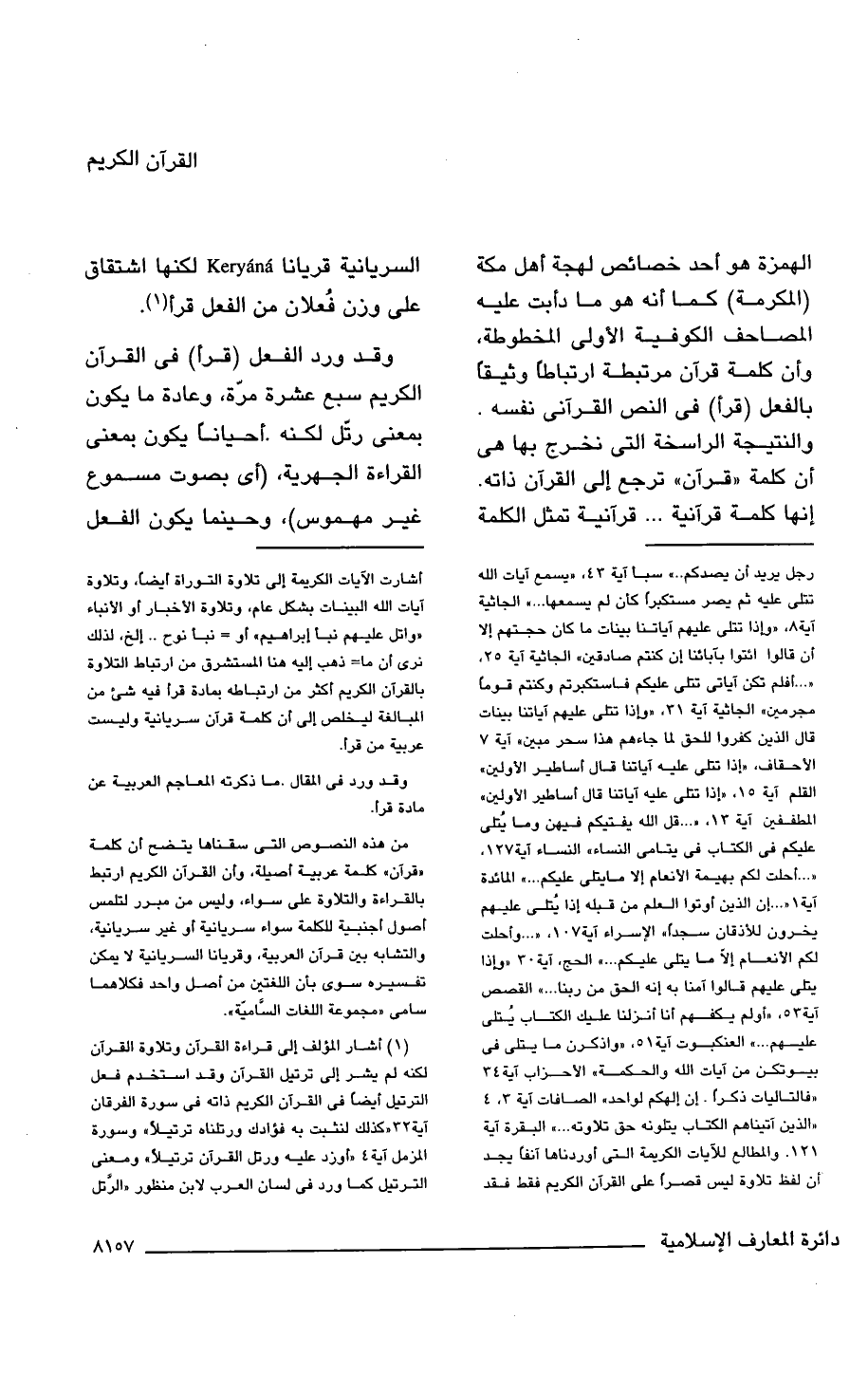 الهمزة هو أحد خصائص لهجة أهل مكة (المكرمة) كما أنه هو ما دأبت عليه المصاحف الكوفية الأولى المخطوطة، وأن كلمة قرآن مرتبطة ارتباطًا وثيقًا بالفعل (قرأ) فى النص القرآنى نفسه. والنتيجة الراسخة التى نخرج بها هى أن كلمة "قرآن" ترجع إلى القرآن ذاته. إنها كلمة قرآنية. . . قرآنية تمثل الكلمة السريانية قريانا Keryana لكنها اشتقاق على وزن فُعلان من الفعل قرأ (¬1).