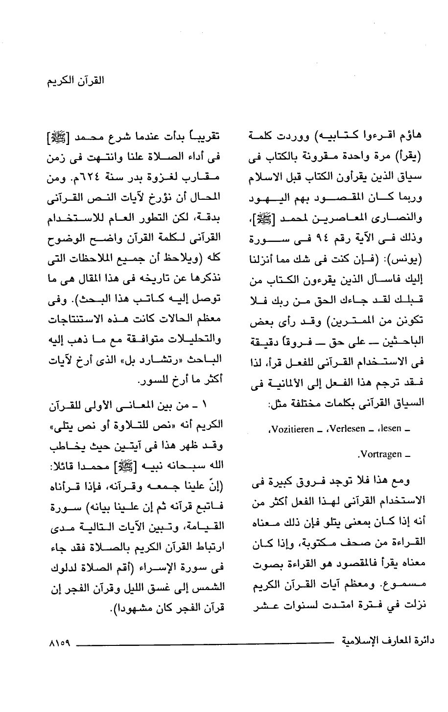 هَاؤُمُ اقْرَءُوا كِتَابِيَهْ} ووردت كلمة (يقرأ) مرة واحدة مقرونة بالكتاب فى سياق الذين يقرأون الكتاب قبل الإسلام وربما كان المقصود بهم اليهود والنصارى المعاصرين لمحمد [-صلى اللَّه عليه وسلم-]، وذلك فى الآية رقم 94 فى سورة (يونس): {فَإِنْ كُنْتَ فِي شَكٍّ مِمَّا أَنْزَلْنَا إِلَيْكَ فَاسْأَلِ الَّذِينَ يَقْرَءُونَ الْكِتَابَ مِنْ قَبْلِكَ لَقَدْ جَاءَكَ الْحَقُّ مِنْ رَبِّكَ فَلَا تَكُونَنَّ مِنَ الْمُمْتَرِينَ} وقد رأى بعض الباحثين -على حق- فروقًا دقيقة فى الاستخدام القرآنى للفعل قرأ، لذا فقد ترجم هذا الفعل إلى الألمانية فى السياق القرآنى بكلمات مختلفة مثل: