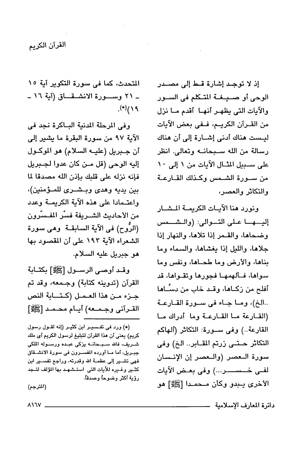 (*) ورد فى تفسير ابن كثير (إنه لقول رسول كريم) يعنى أن هذا القرآن لتبليغ لرسول الكريم أى ملك شريف، فاللَّه سبحانه يزكى عبده ورسوله الملكى جبريل، أما ما أورده المفسرون فى سورة الانشقاق فهى تشير إلى عظمة اللَّه وقدرته، وراجع تفسير ابن كثير وغيره للآيات التى استشهد بها المؤلف لتجد رؤية أكثر وضوحًا وصدقًا. (المترجم)