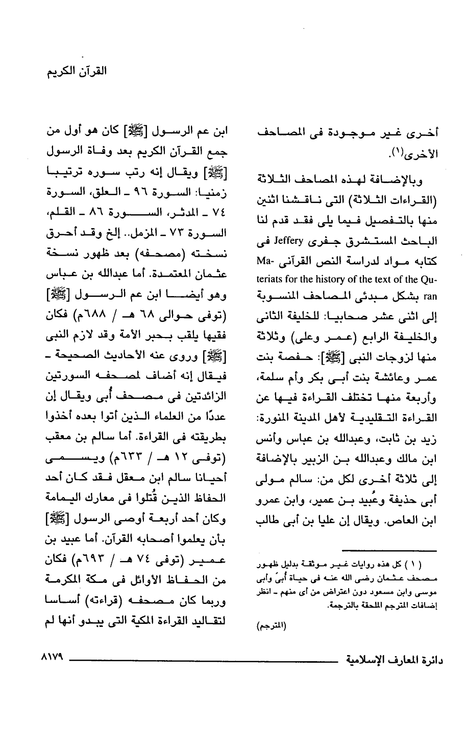 (¬1) كل هذه روايات غير موثقة بدليل ظهور مصحف عثمان رضى اللَّه عنه فى حياة أُبىّ وأبى موسى وابن مسعود دون اعتراض من أى منهم -انظر إضاقات المترجم الملحقة بالترجمة. (المترجم)