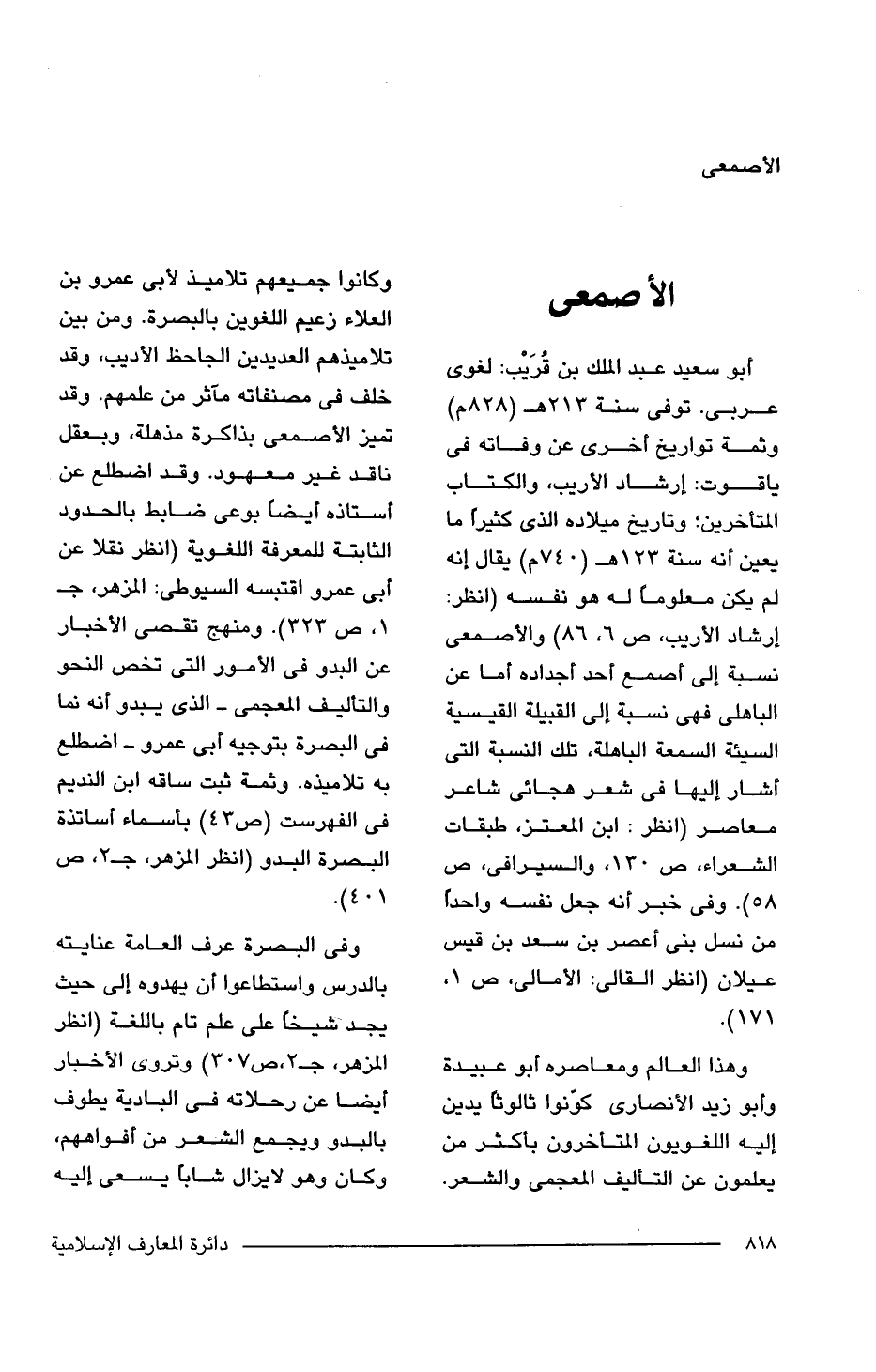 أبو سعيد عبد الملك بن قُرَيْب: لغوى عربى. توفى سنة 213 هـ (828 م) وثمة تواريخ أخرى عن وفاته فى ياقوت: إرشاد الأريب، والكتاب المتأخرين؛ وتاريخ ميلاده الذى كثير، ما يعين أنه سنة 123 هـ (740 م) يقال إنه لم يكن معلومًا له هو نفسه (انظر: إرشاد الأريب، ص 6، 86) والأصمعى نسبة إلى أصمع أحد أجداده أما عن الباهلى فهى نسبة إلى القبيلة القيسية السيئة السمعة الباهلة، تلك النسبة التى أشار إليها فى شعر هجائى شاعر معاصر (انظر: ابن المعتز، طبقات الشعراء، ص 130، والسيرافى، ص 58). وفى خبر أنه جعل نفسه واحدًا من نسل بنى أعصر بن سعد بن قيس عيلان (انظر القالى: الأمالى، ص 1، 171).