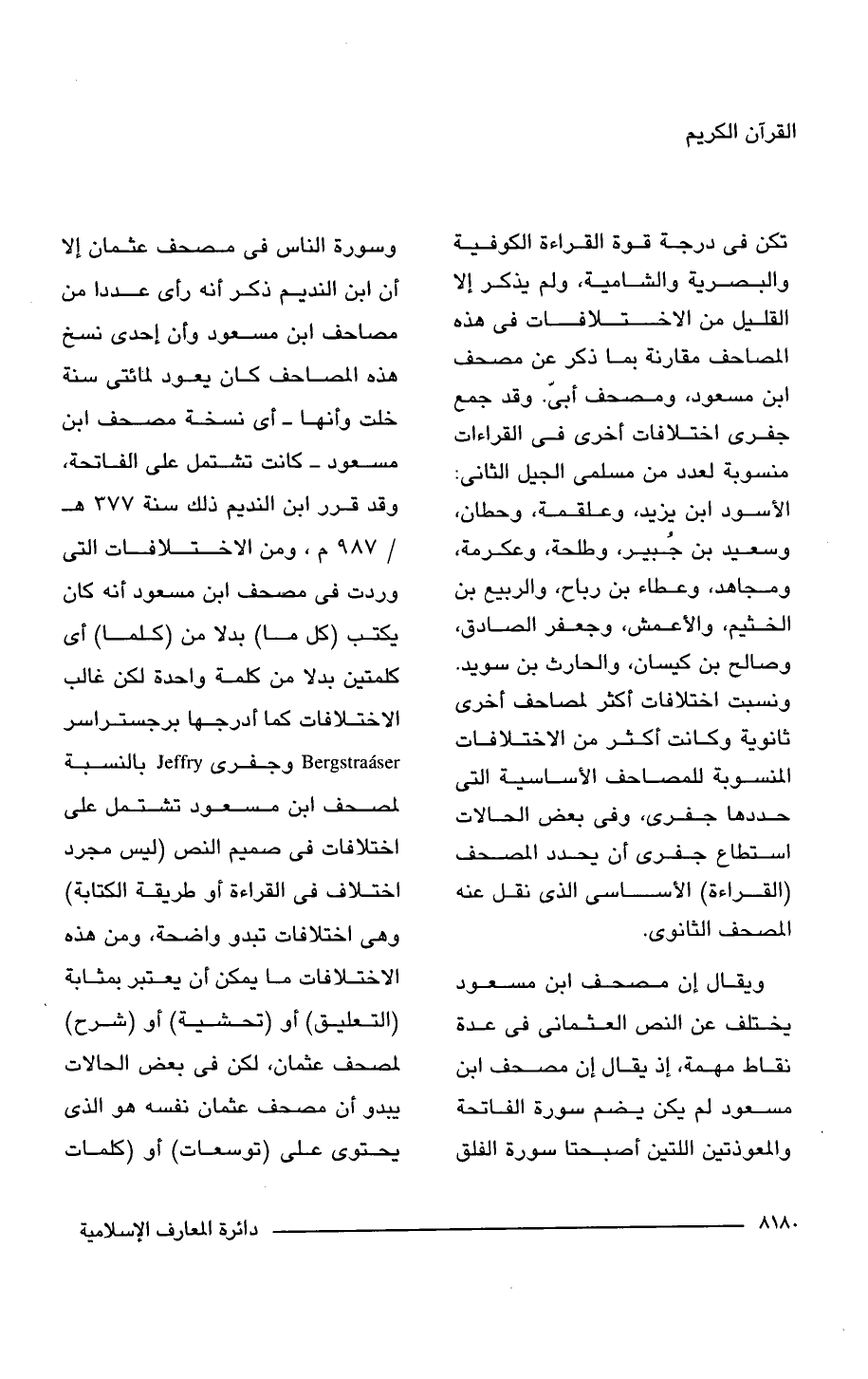 تكن فى درجة قوة القراءة الكوفية والبصرية والشامية، ولم يذكر إلا القليل من الاختلافات فى هذه المصاحف مقارنة بما ذكر عن مصحف ابن مسعود، ومصحف أبىّ. وقد جمع جفرى اختلافات أخرى فى القراءات منسوبة لعدد من مسلمى الجيل الثانى: الأسود ابن يزيد، وعلقمة، وحطان، وسعيد بن جُبير، وطلحة، وعكرمة، ومجاهد، وعطاء بن رباح، والربيع بن الخثيم، والأعمش، وجعفر الصادق، وصالح بن كيسان، والحارث بن سويد. ونسبت اختلافات أكثر لمصاحف أخرى ثانوية وكانت أكثر من الاختلافات المنسوبة للمصاحف الأساسية التى حددها جفرى، وفى بعض الحالات استطاع جفرى أن يحدد المصحف (القراءة) الأساسى الذى نقل عنه المصحف الثانوى.