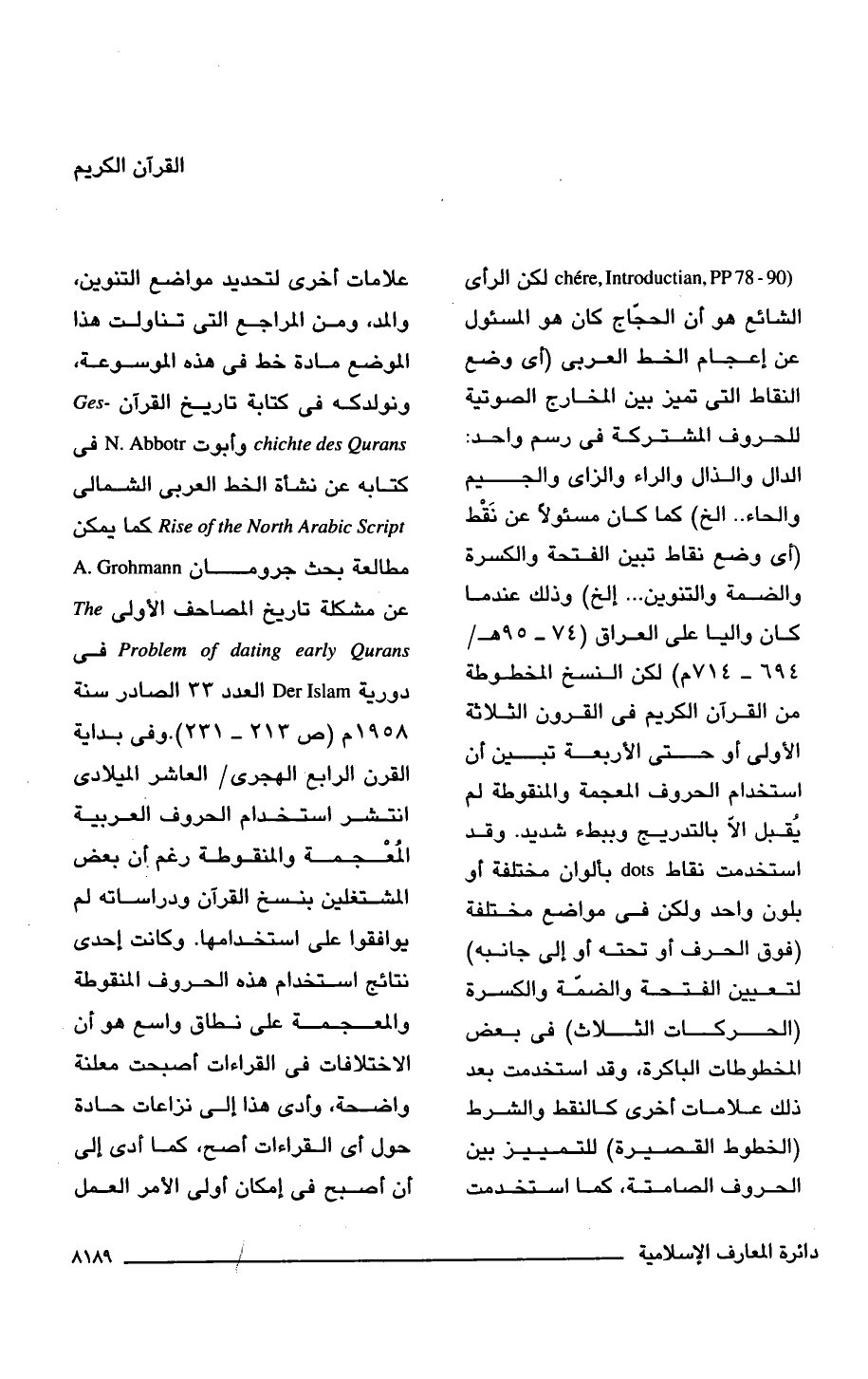 chere, Introductian, PP 78 - 90) لكن الرأى الشائع هو أن الحجَاج كان هو المسئول عن إعجام الخط العربى أى وضع النقاط التى تميز بين المخارج الصوتية للحروف المشتركة فى رسم واحد: الدال والذال والراء والزاى والجيم والحاء. . الخ) كما كان مسئولًا عن نَقْط (أى وضع نقاط تبين الفتحة والكسرة والضمة والتنوين. . . إلخ) وذلك عندما كان واليا على العراق (74 - 95 هـ/ 694 - 714 م) لكن النسخ المخطوطة من القرآن الكريم فى القرون الثلاثة الأولى أو حتى الأربعة تبين أن استخدام الحروف المعجمة والمنقوطة لم يُقبل إلّا بالتدريج وببطء شديد. وقد استخدمت نقاط dots بألوان مختلفة أو بلون واحد ولكن فى مواضع مختلفة (فوق الحرف أو تحته أو إلى جانبه) لتعيين الفتحة والضمَّة والكسرة (الحركات الثلاث) فى بعض المخطوطات الباكرة، وقد استخدمت بعد ذلك علامات أخرى كالنقط والشرط (الخطوط القصيرة) للتمييز بين الحروف الصامتة، كما استخدمت علامات أخرى لتحديد مواضع التنوين، والمد، ومن المراجع التى تناولت هذا الموضع مادة خط فى هذه الموسوعة، ونولدكه فى كتابة تاريخ القرآن Geschichte des Qurans وأبوت N. Abbotr فى كتابه عن نشأة الخط العربى الشمالى Rise of the North Arabic Script كما يمكن مطالعة بحث جرومان A. Grohmann عن مشكلة تاريخ المصاحف الأولى The Problem of dating early Qurans فى دورية Der Islam العدد 33 الصادر سنة 1958 م (ص 213 - 231). وفى بداية القرن الرابع الهجرى/ العاشر الميلادى انتشر استخدام الحروف العربية المُعْجمة والمنقوطة رغم إن بعض المشتغلين بنسخ القرآن ودراساته لم يوافقوا على استخدامها. وكانت إحدى نتائج استخدام هذه الحروف المنقوطة والمعجمة على نطاق واسع هو أن الاختلافات فى القراءات أصبحت معلنة واضحة، وأدى هذا إلى نزاعات حادة حول أى القراءات أصح، كما أدى إلى أن أصبح فى إمكان أولى الأمر العمل
