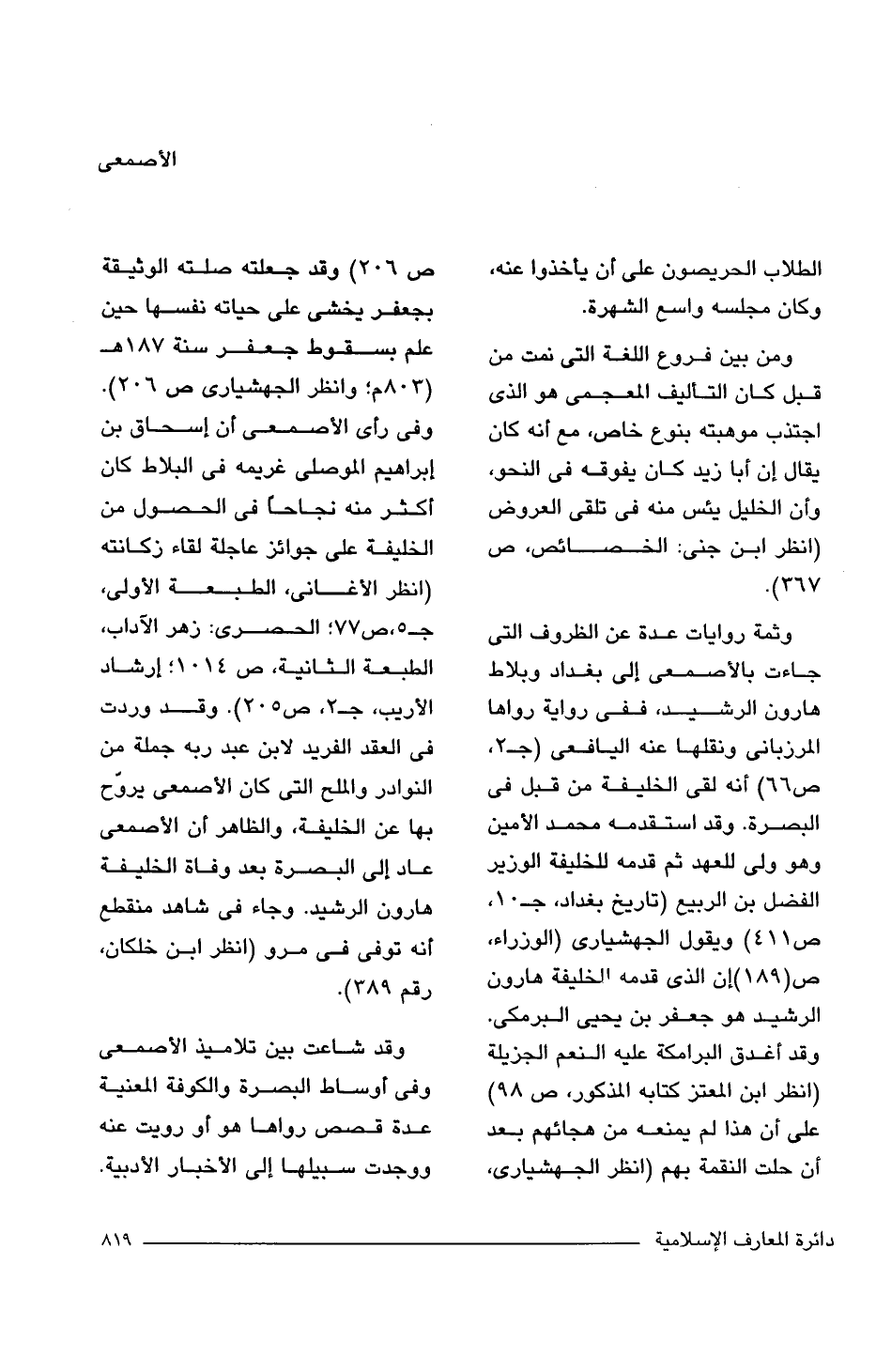 وثمة روايات عدة عن الظروف التى جاءت بالأصمعى إلى بغداد وبلاط هارون الرشيد، ففى رواية رواها المرزبانى ونقلها عنه اليافعى (جـ 2، ص 66) أنه لقى الخليفة من قبل فى البصرة. وقد استقدمه محمد الأمين وهو ولى للعهد ثم قدمه للخليفة الوزير الفضل بن الربيع (تاريخ بغداد، جـ 10، ص 411) ويقول الجهشيارى (الوزراء، ص (189) إن الذى قدمه الخليفة هارون الرشيد هو جعفر بن يحيى البرمكى. وقد اْغدق البرامكة عليه النعم الجزيلة (انظر ابن المعتز كتابه المذكور، ص 98) على أن هذا لم يمنعه من هجائهم بعد أن حلت النقمة بهم (انظر الجهشيارى، ص 206) وقد جعلته صلته الوثيقة بجعفر يخشى على حياته نفسها حين علم بسقوط جعفر سنة 187 هـ (803 م؛ وانظر الجهشيارى ص 206). وفى رأى الأصمعى أن إسحاق بن إبراهيم الموصلى غريمه فى البلاط كان أكثر منه نجاحًا فى الحصول من الخليفة على جوائز عاجلة لقاء زكانته (انظر الأغانى، الطبعة الأولى، جـ 5، ص 77؛ الحصرى: زهر الآداب، الطبعة الثانية، ص 1014؛ إرشاد الأريب، جـ 2، ص 205). وقد وردت فى العقد الفريد لابن عبد ربه جملة من النوادر والملح التى كان الأصمعى يروّح بها عن الخليفة، والظاهر أن الأصمعى عاد إلى البصرة بعد وفاة الخليفة هارون الرشيد. وجاء فى شاهد منقطع أنه توفى فى مرو (انظر ابن خلكان، رقم 389).