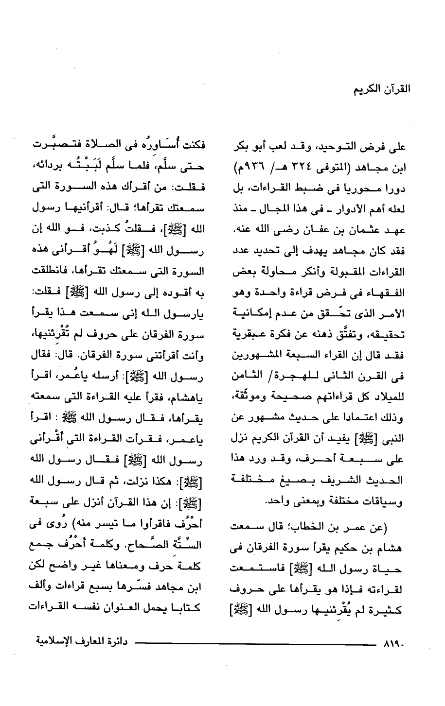 (عن عمر بن الخطاب؛ قال سمعت هشام بن حكيم يقرأ سورة الفرقان فى حياة رسول اللَّه [-صلى اللَّه عليه وسلم-] فاستمعت لقراءته فإذا هو يقرأها على حروف كثيرة لم يُقْرِئنيها رسول اللَّه [-صلى اللَّه عليه وسلم-] فكنت أسَاوِرُه فى الصلاة فتصبَّرت حتى سلَّم، فلما سلَّم لَبَبْته بردائه، فقلت: من أقرأك هذه السورة التى سمعتك تقرأها؟ قال: أقرأنيها رسول اللَّه [-صلى اللَّه عليه وسلم-]، فقلتُ كذبت، فواللَّه إن رسول اللَّه [-صلى اللَّه عليه وسلم-] لَهُو أقرأنى هذه السورة التى سمعتك تقرأها، فانطلقت به أقوده إلى رسول اللَّه [-صلى اللَّه عليه وسلم-] فقلت: يا رسول اللَّه إنى سمعت هذا يقرأ سورة الفرقان على حروف لم تُقْرِئنيها، وأنت أقرأتنى سورة الفرقان. قال: فقال رسول اللَّه [-صلى اللَّه عليه وسلم-]: أرسله يا عُمر، اقرأ يا هشام، فقرأ عليه القراءة التى سمعته يقرأها، فقال رسول اللَّه [-صلى اللَّه عليه وسلم-]: اقرأ يا عمر، فقرأت القراءة التى أقْرأنى رسول اللَّه [-صلى اللَّه عليه وسلم-] فقال رسول اللَّه [-صلى اللَّه عليه وسلم-]: هكذا نزلت، ثم قال رسول اللَّه [-صلى اللَّه عليه وسلم-]: إن هذا القرآن أنزل على سبعة أحْرُف فاقرأوا ما تيسر منه) رُوى فى السِّتَّة الصِّحاح. وكلمة أحرُف جمع كلمة حرف ومعناها غير واضح لكن ابن مجاهد فسَّرها بسبع قراءات وألف كتابا يحمل العنوان نفسه القراءات